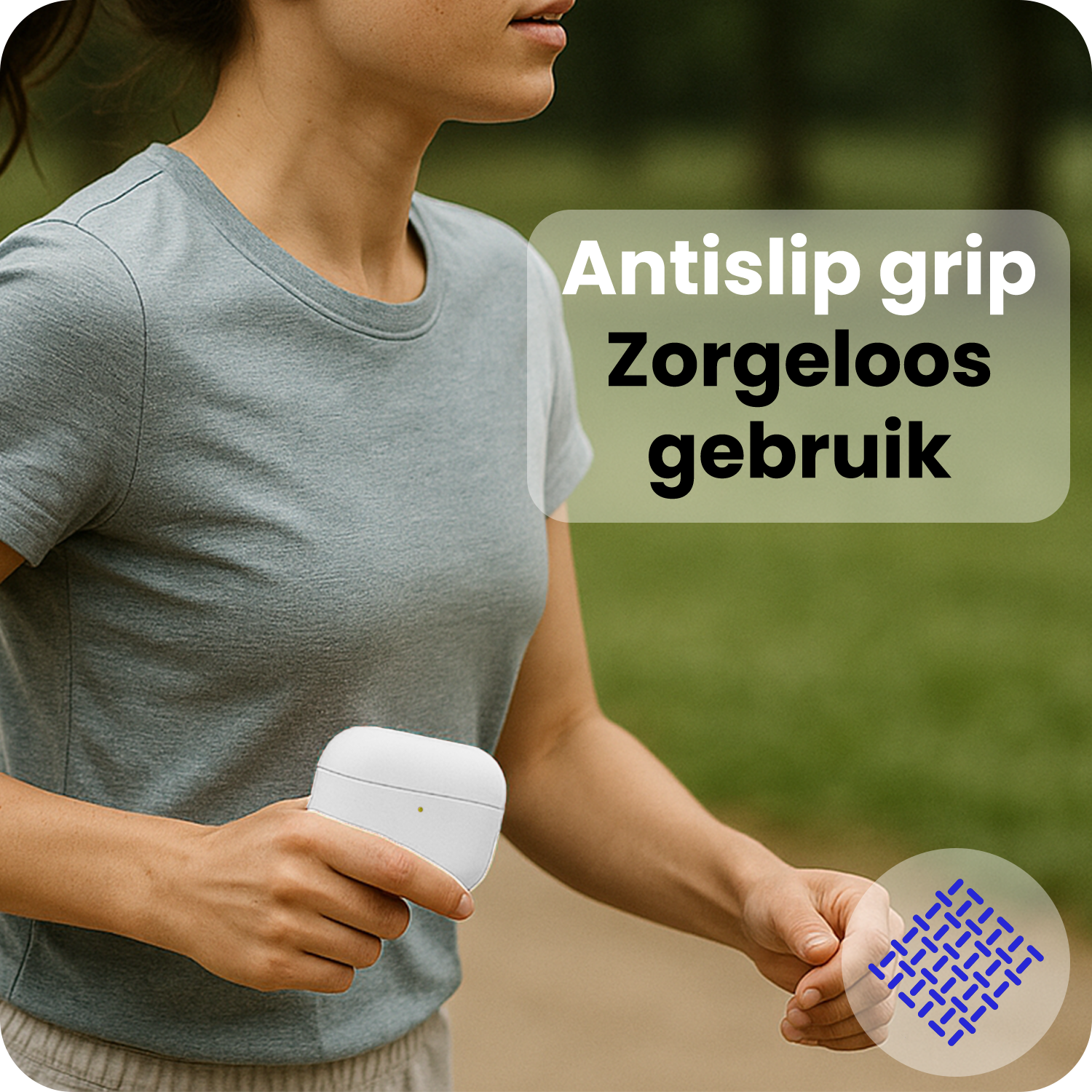 Dankzij de zachte, matte afwerking ligt je AirPods Pro 3 stevig in de hand en glijdt het minder snel uit je vingers. Dit biedt extra zekerheid en gebruiksgemak.