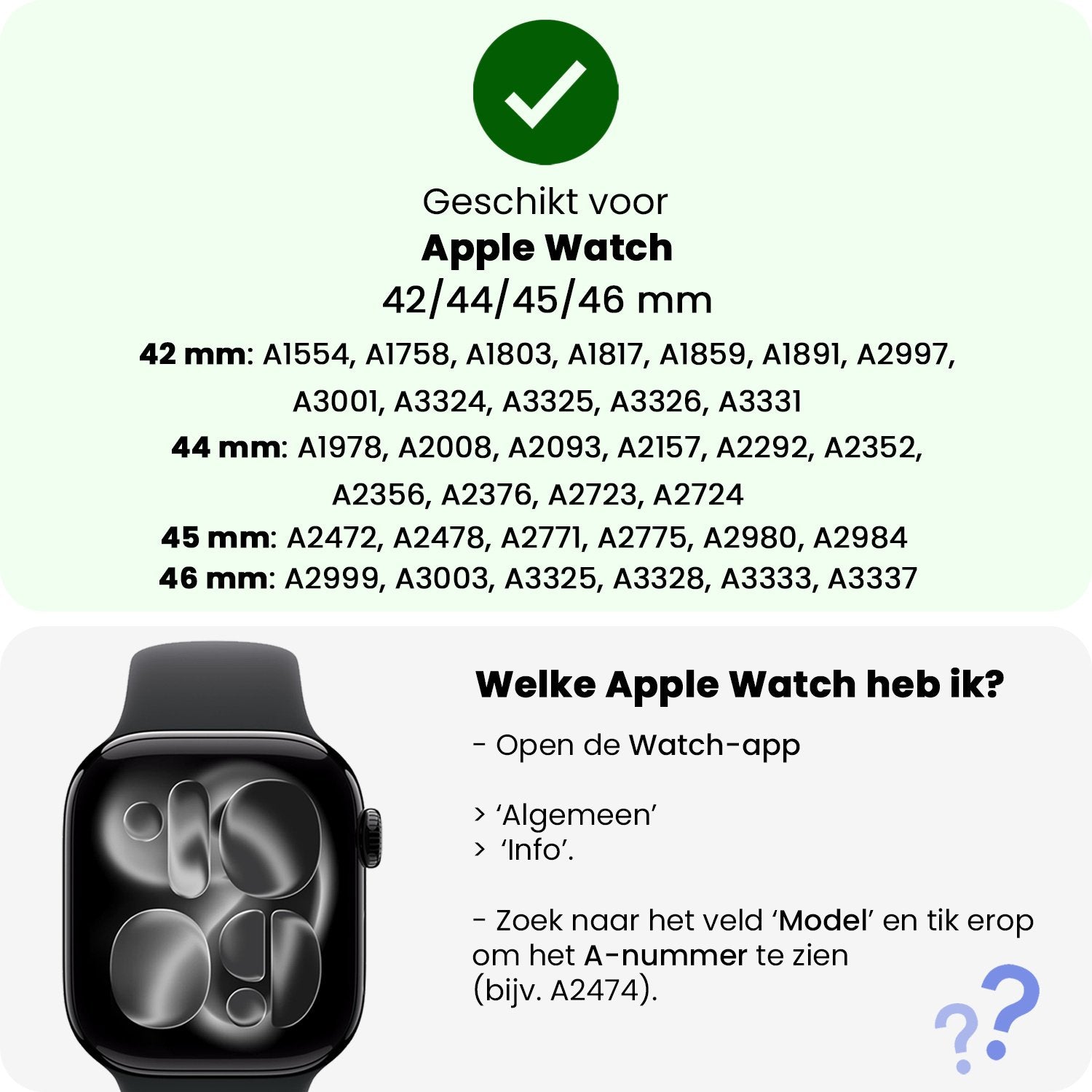 - Apple Watch 1, 2, 3, 4, 5, 6, 7, 8, 9, 10, 11, SE - 42/44/45/46 mm (controleer voor de zekerheid je model voordat je bestelt)