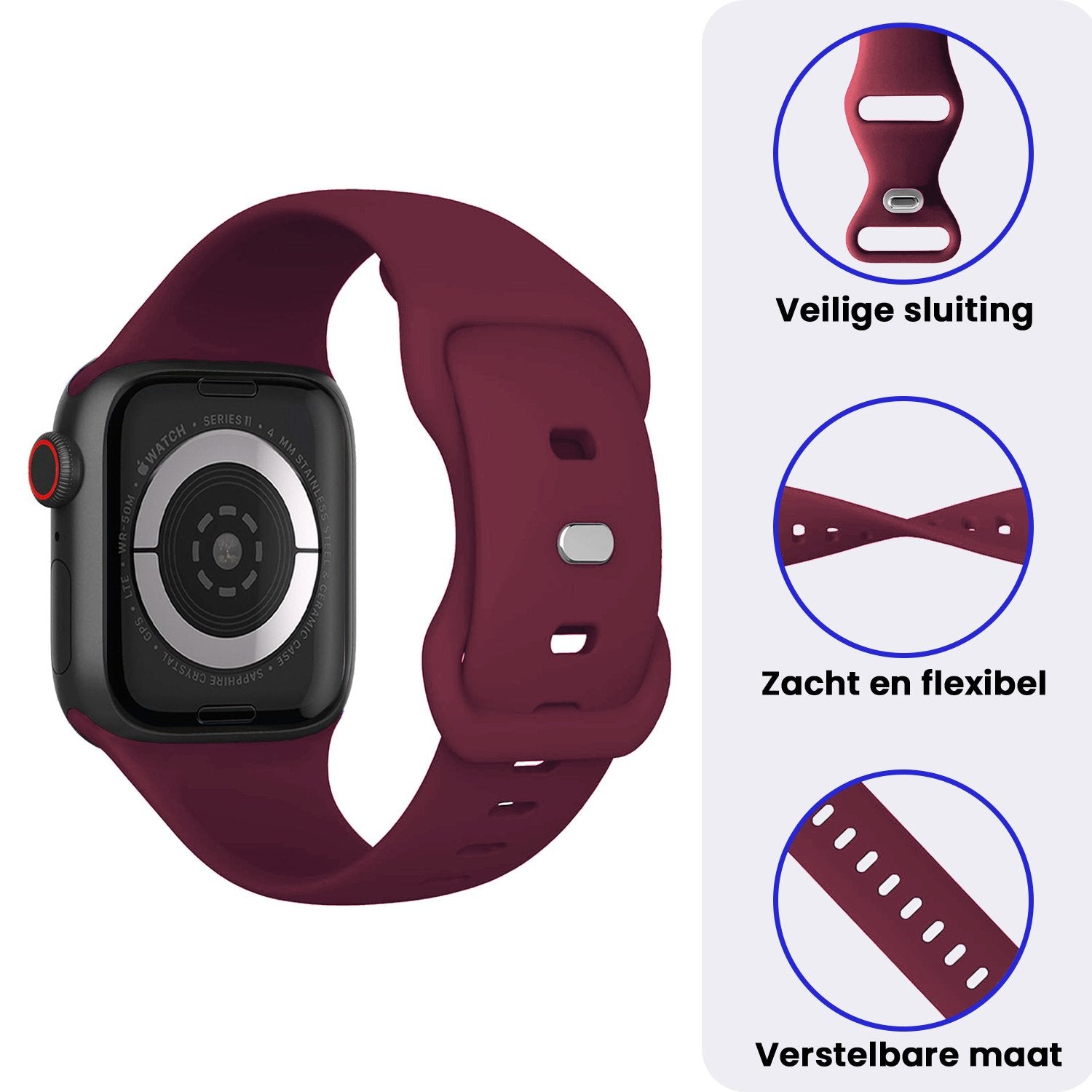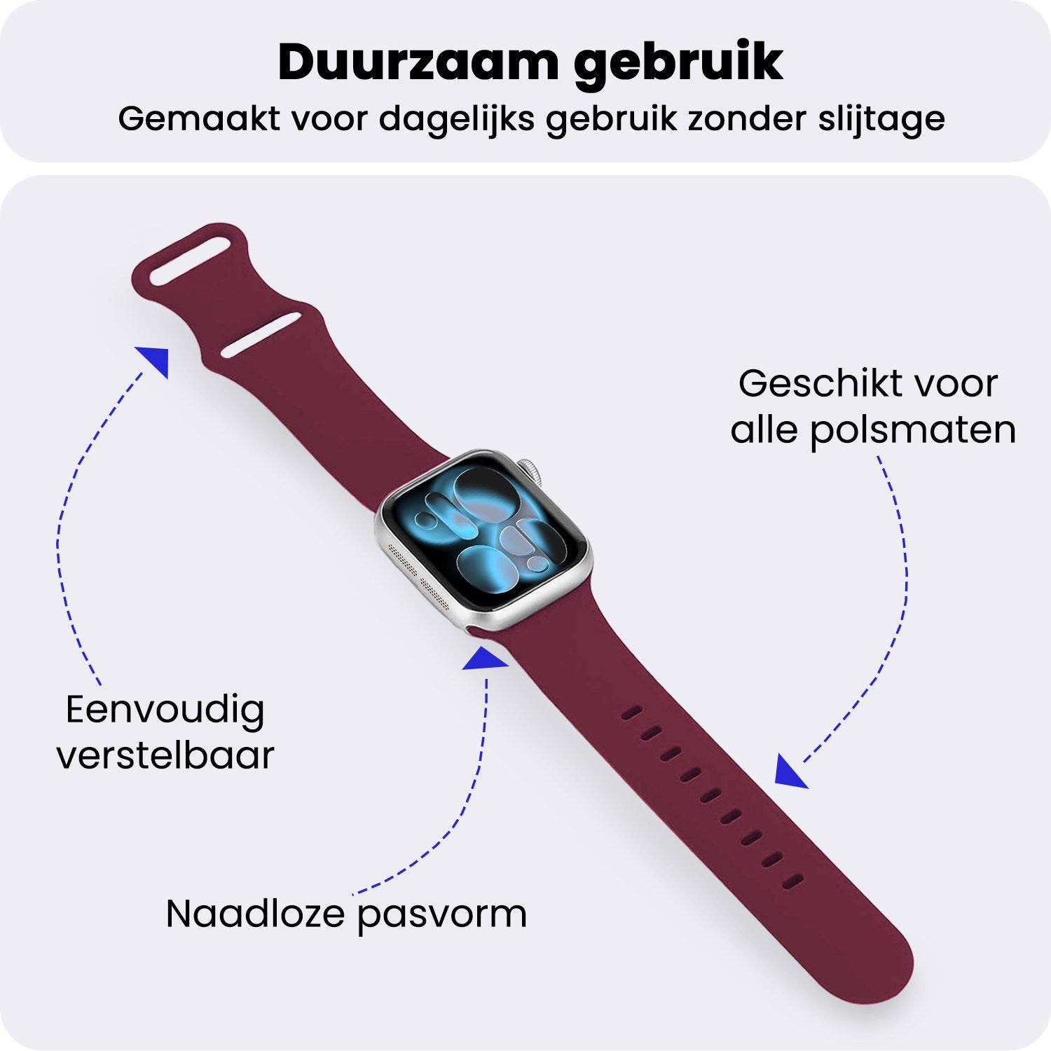 Het kwalitatief hoogwaardige siliconen biedt een comfortabele draagervaring zonder in te leveren op de sterkte. Het is ontworpen om de dagelijkse slijtage te weerstaan, terwijl het toch goed aanvoelt aan de pols. Dankzij het verstelbare sluitsysteem kan je de band gemakkelijk aanpassen, waardoor je Apple Watch 1, 2, 3, 4, 5, 6, 7, 8, 9, 10, 11, SE - 42/44/45/46 mm veilig en comfortabel blijft zitten, ongeacht je activiteiten.