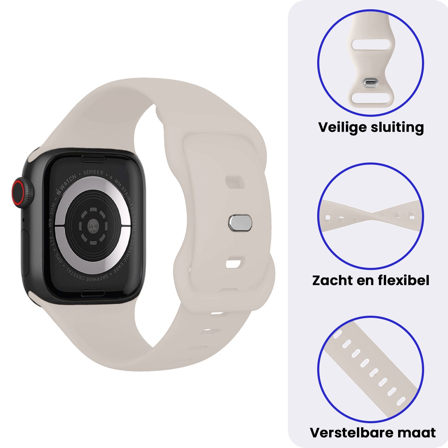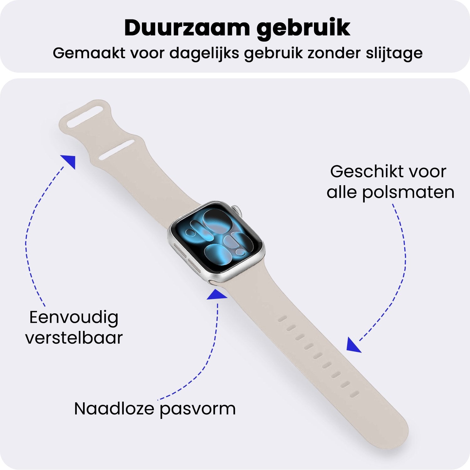 Het kwalitatief hoogwaardige siliconen biedt een comfortabele draagervaring zonder in te leveren op de sterkte. Het is ontworpen om de dagelijkse slijtage te weerstaan, terwijl het toch goed aanvoelt aan de pols. Dankzij het verstelbare sluitsysteem kan je de band gemakkelijk aanpassen, waardoor je Apple Watch 1, 2, 3, 4, 5, 6, 7, 8, 9, 10, 11, SE - 42/44/45/46 mm veilig en comfortabel blijft zitten, ongeacht je activiteiten.