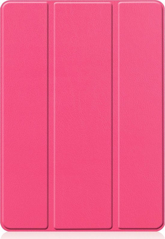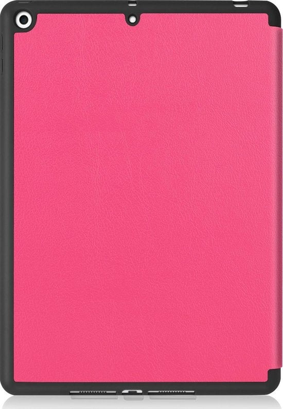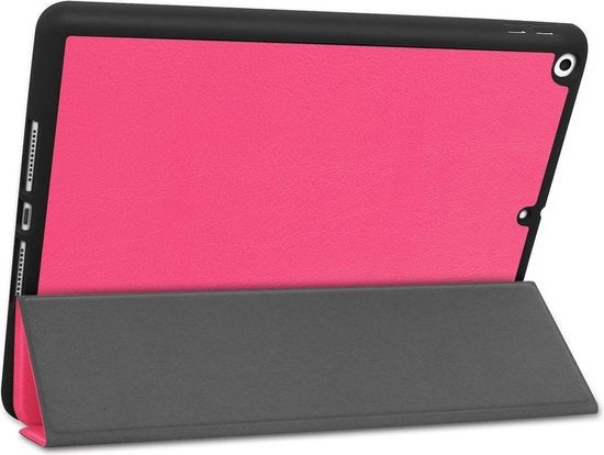 Maak je iPad 10.2 2019 compleet met deze functionele en stijlvolle Trifold Bookcase Hoes - donkerroze. **Bestel nu en ervaar de perfecte balans tussen bescherming en gebruiksgemak!**