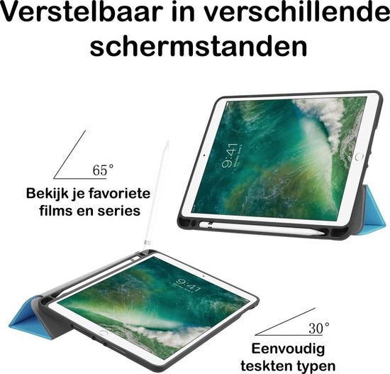 Maak je iPad 2018 compleet met deze functionele en stijlvolle Trifold Bookcase Hoes - lichtblauwe. **Bestel nu en ervaar de perfecte balans tussen bescherming en gebruiksgemak!**