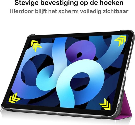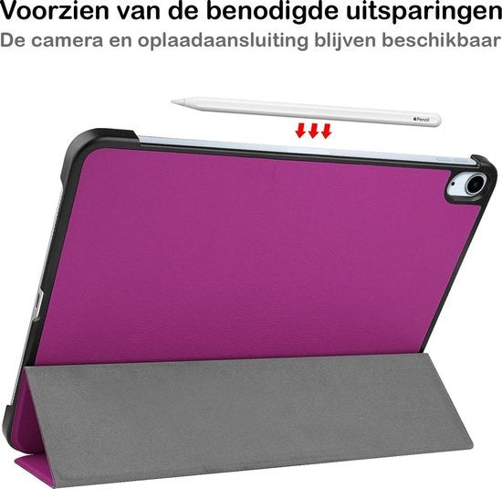 Maak je iPad Air 2020 compleet met deze functionele en stijlvolle Trifold Bookcase Hoes - paarse. **Bestel nu en ervaar de perfecte balans tussen bescherming en gebruiksgemak!**