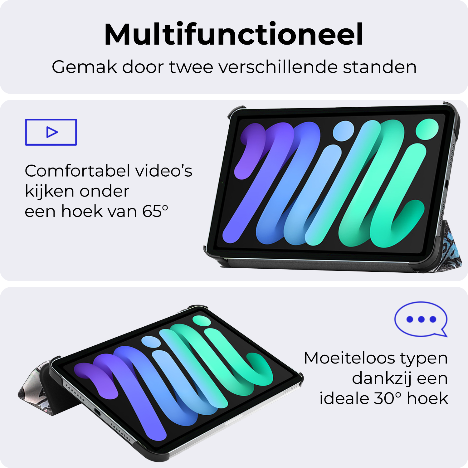 Dankzij het slimme drievoudige ontwerp vouw je de hoes eenvoudig om in twee verschillende kijkhoeken. Ideaal om handsfree video's te bekijken, te typen of te videobellen.