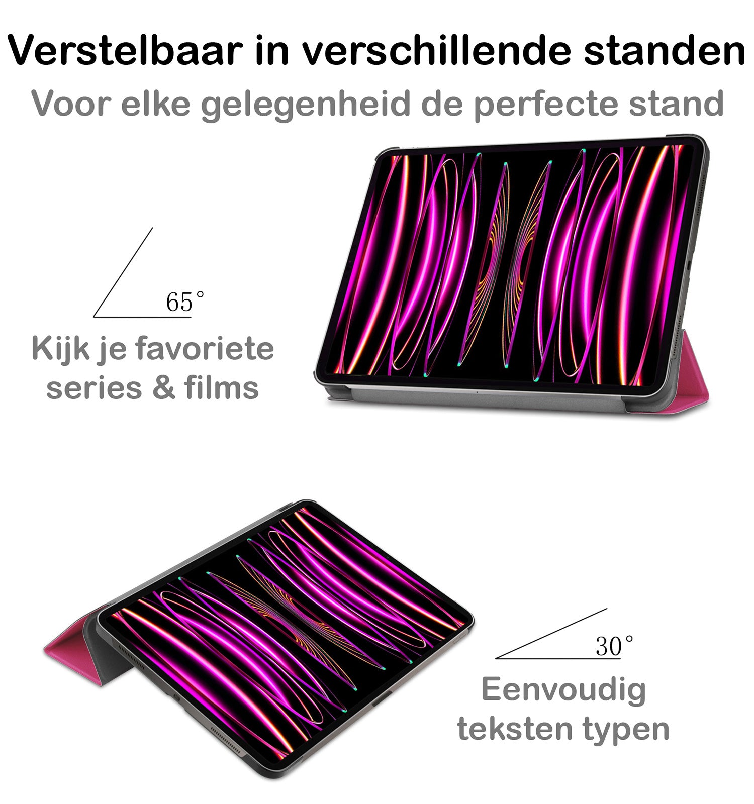 Dankzij het slimme drievoudige ontwerp vouw je de hoes eenvoudig om in twee verschillende kijkhoeken. Ideaal om handsfree video's te bekijken, te typen of te videobellen.