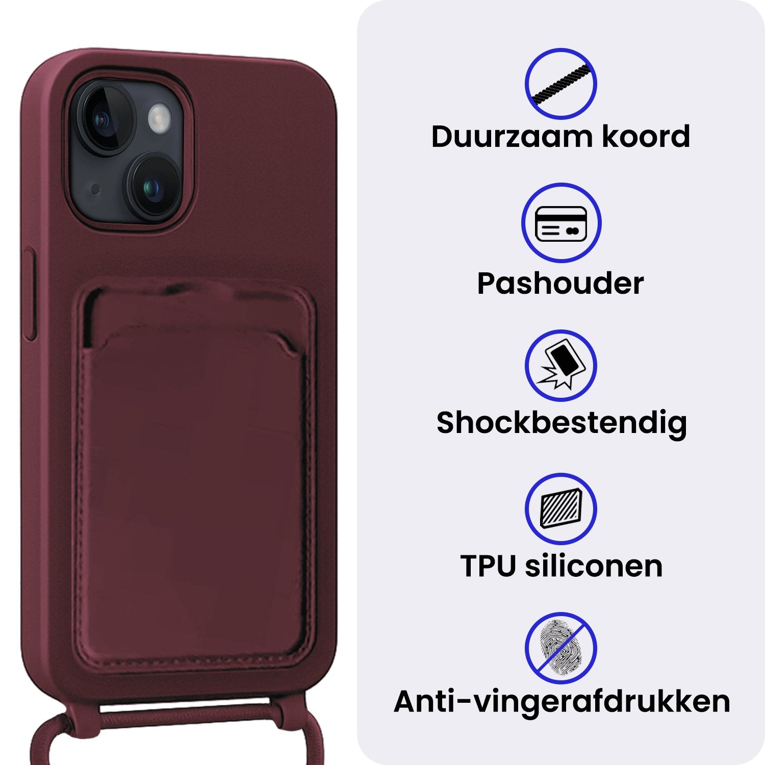 iPhone 13 Hoesje Met Telefoonkoord en Pasjeshouder Siliconen - Aubergine
