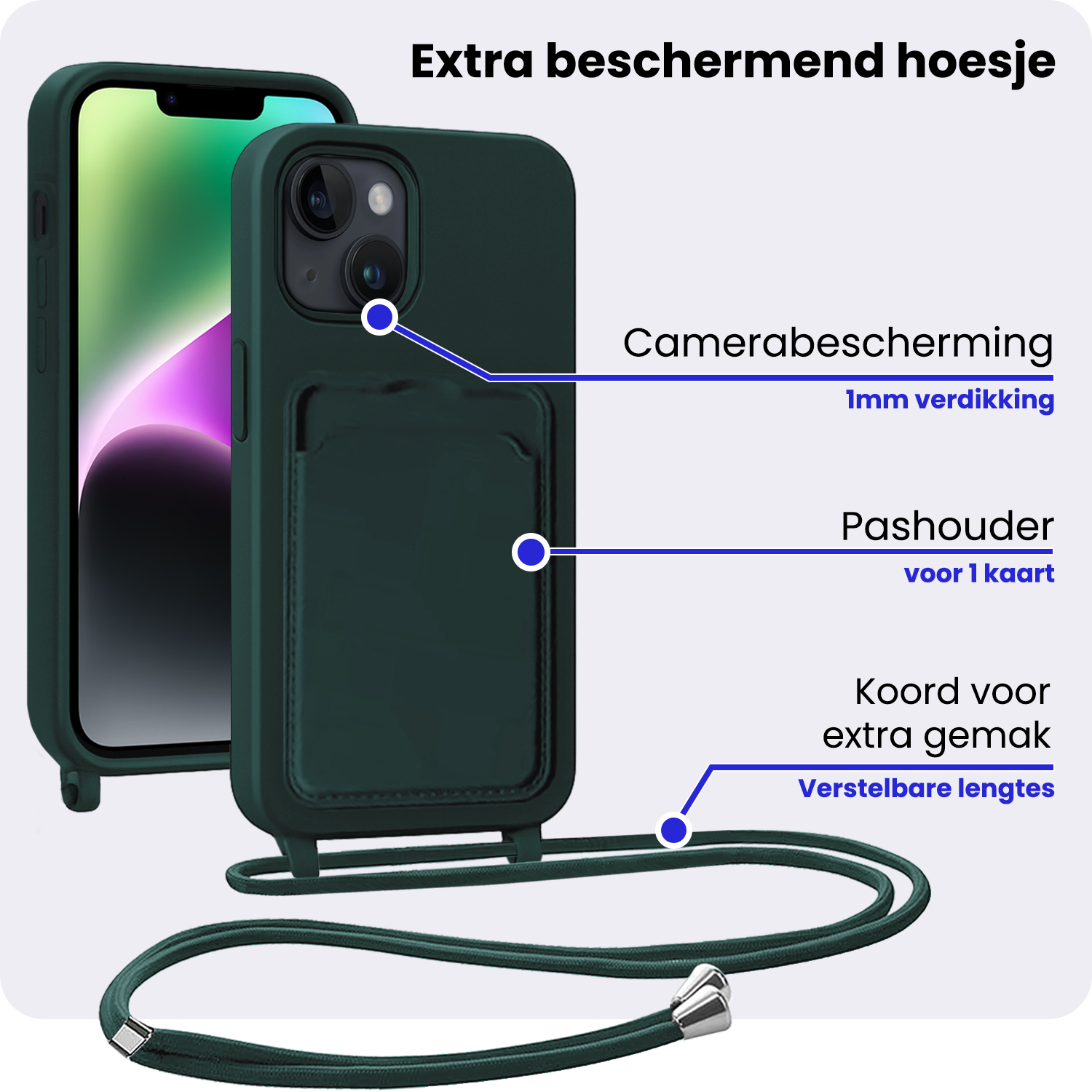 - Verstelbaar koord – Draag je telefoon handsfree en veilig om je nek of schouder