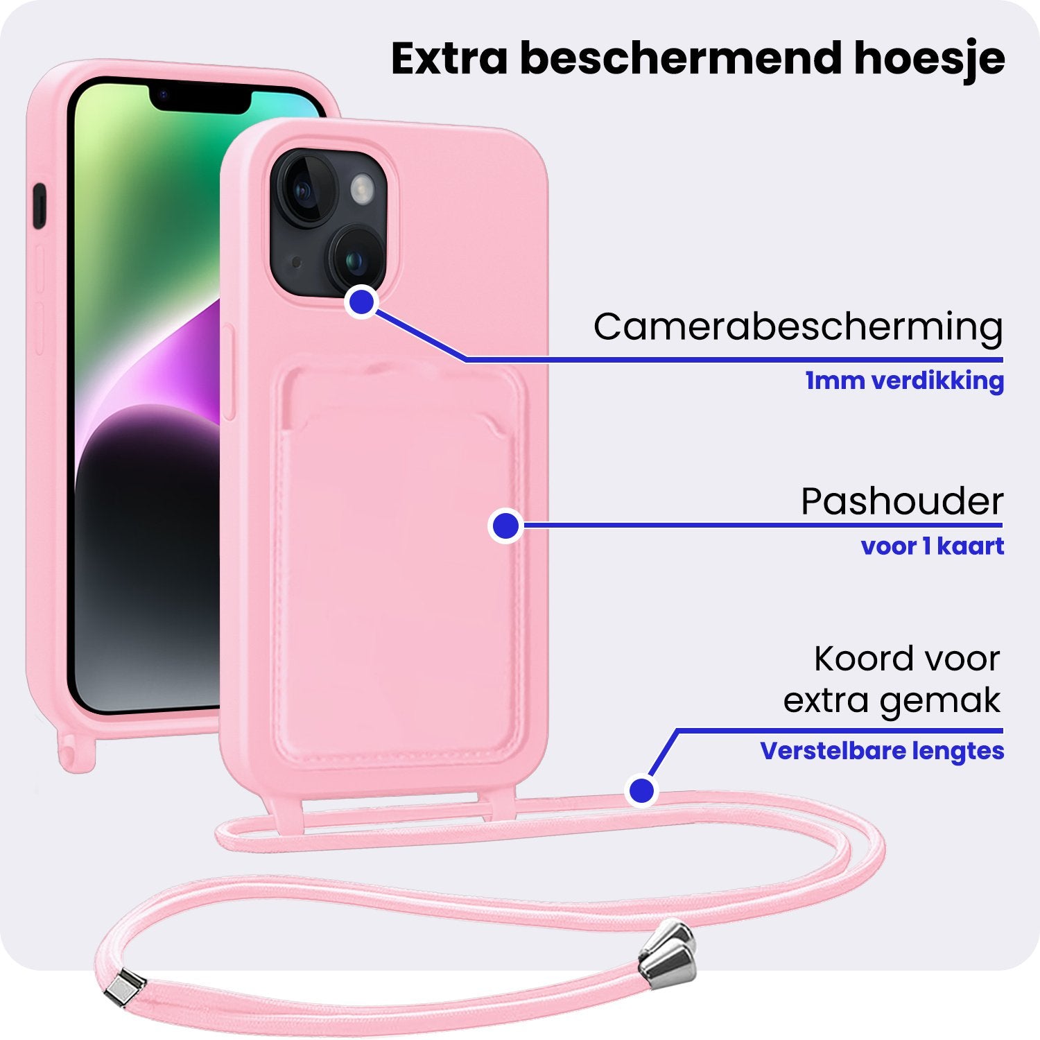 iPhone 14 Plus Hoesje Met Telefoonkoord en Pasjeshouder Siliconen - Lichtroze