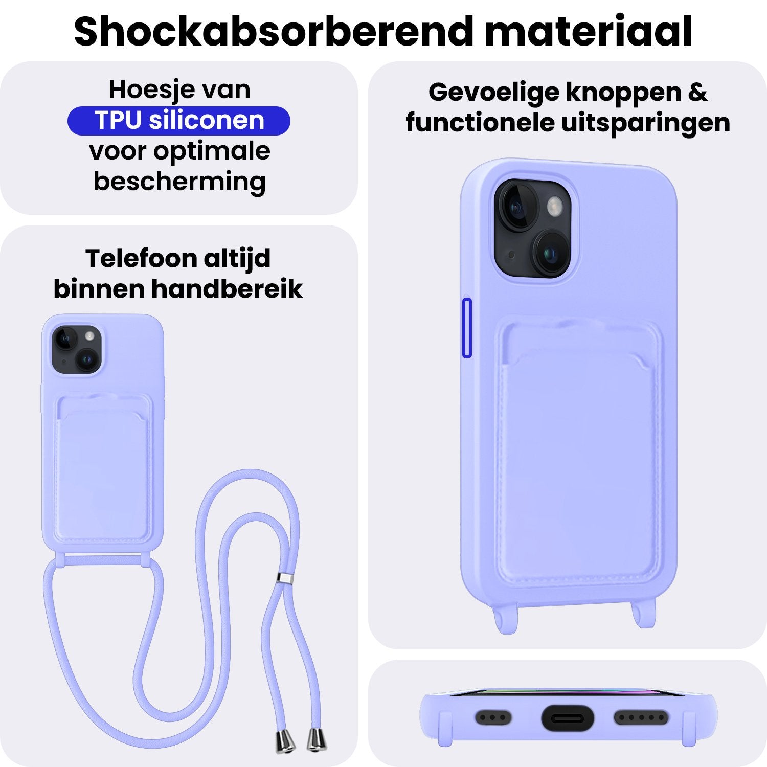 iPhone 14 Plus Hoesje Met Telefoonkoord en Pasjeshouder Siliconen - Lila