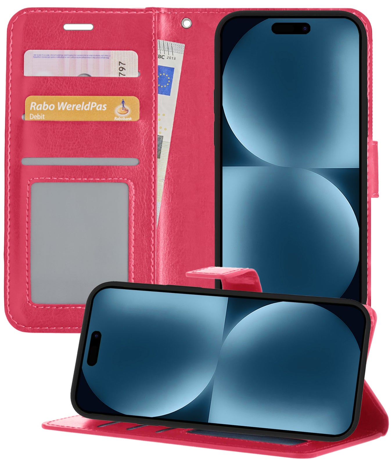 iPhone 15 Hoesje Bookcase Cover met Kaarthouder - Donkerroze