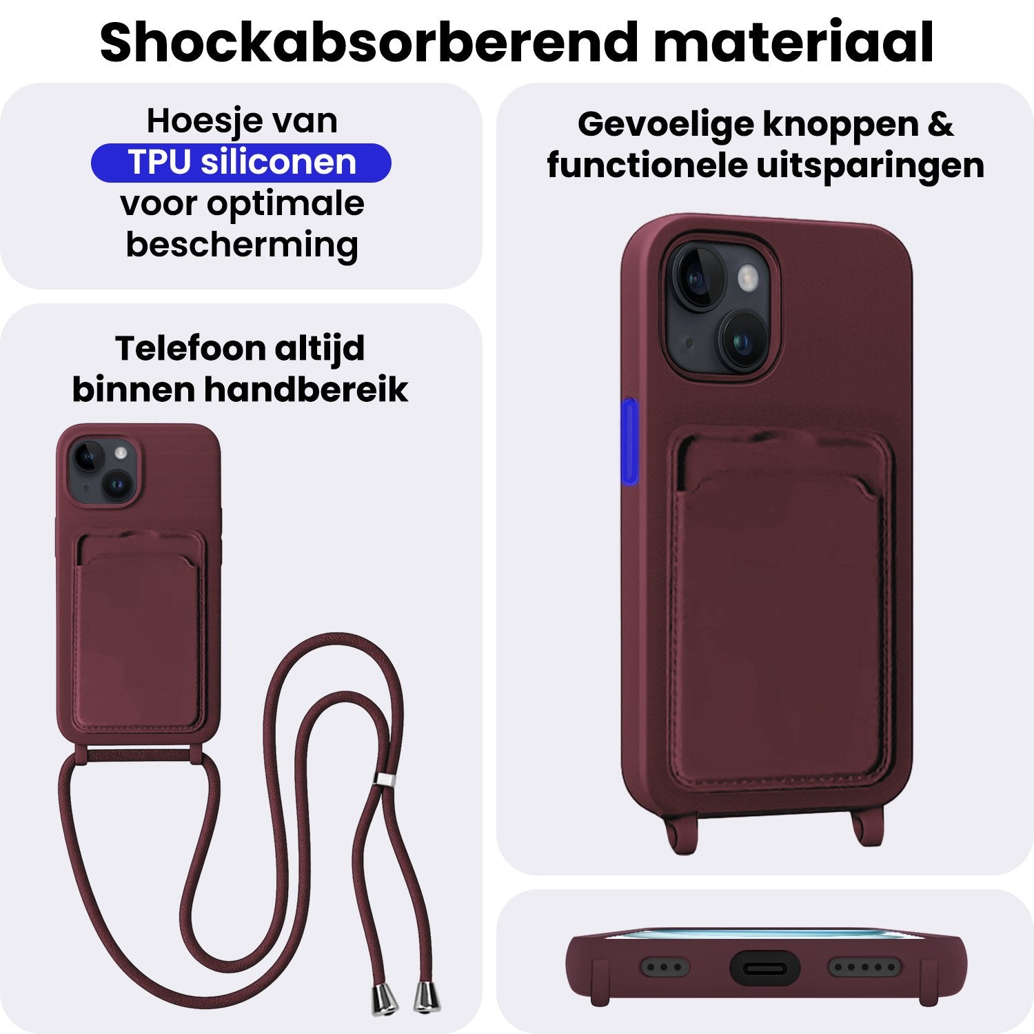 iPhone 15 Hoesje Met Telefoonkoord en Pasjeshouder Siliconen - Aubergine