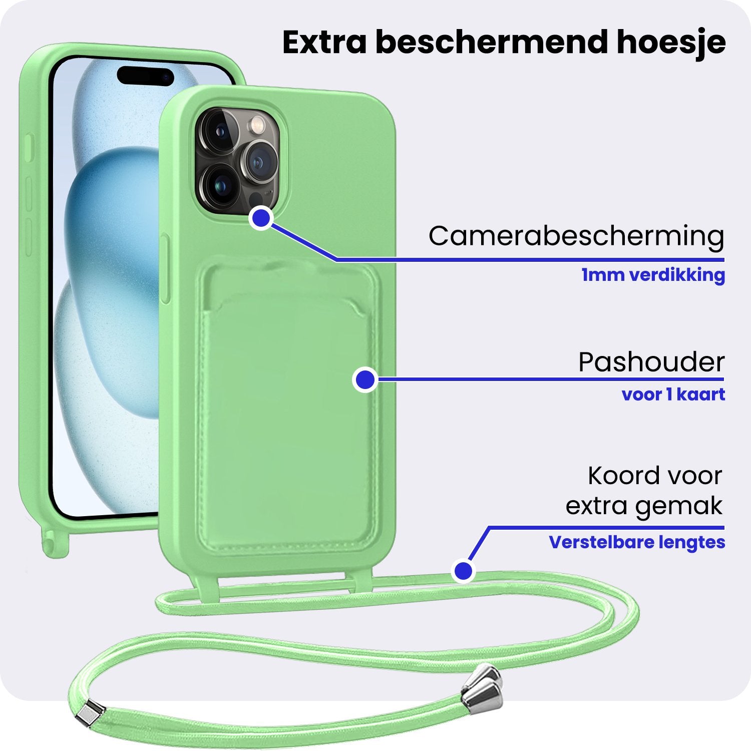 - Verstelbaar koord – Draag je telefoon handsfree en veilig om je nek of schouder
