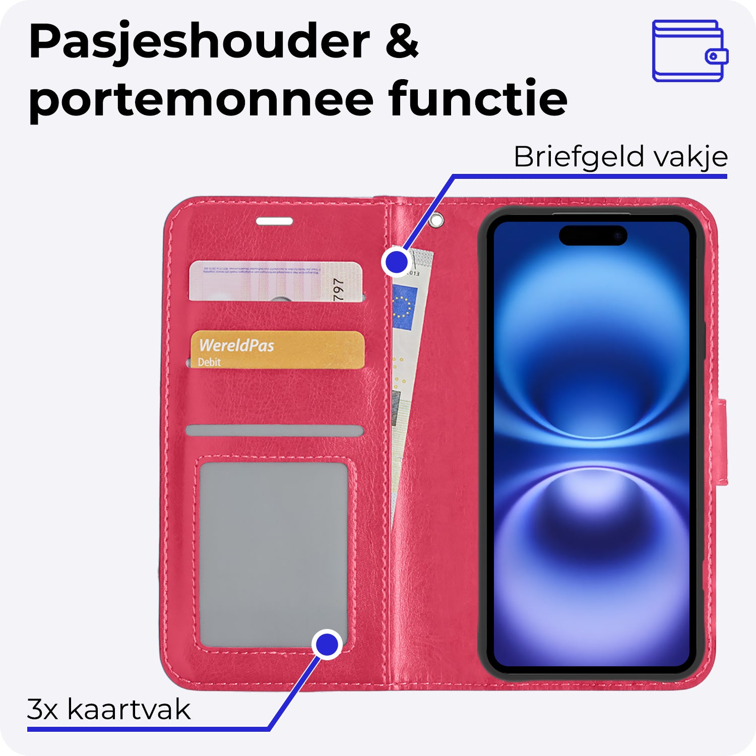 - Ruimte voor pasjes en briefgeld