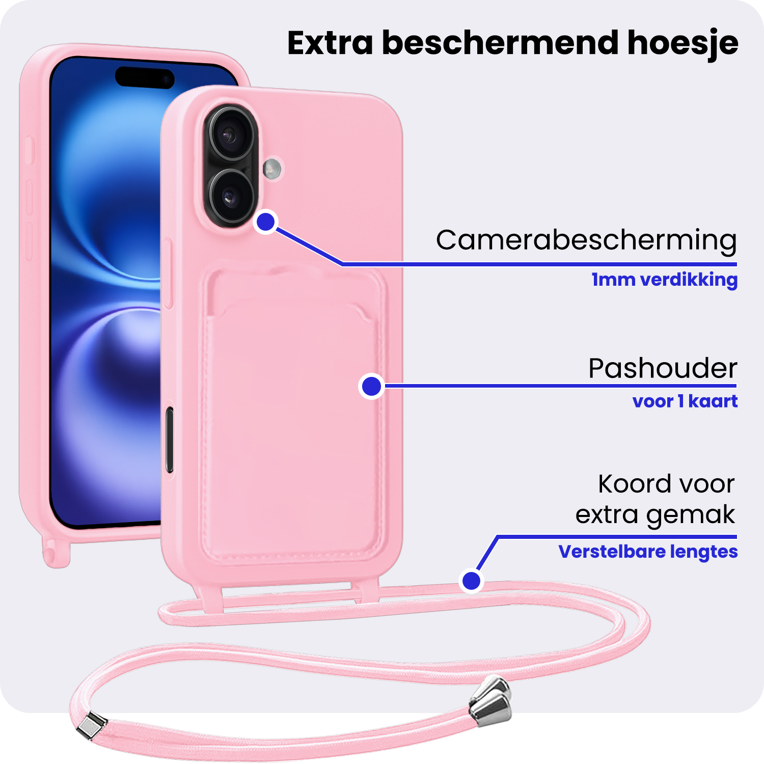 - Verstelbaar koord – Draag je telefoon handsfree en veilig om je nek of schouder