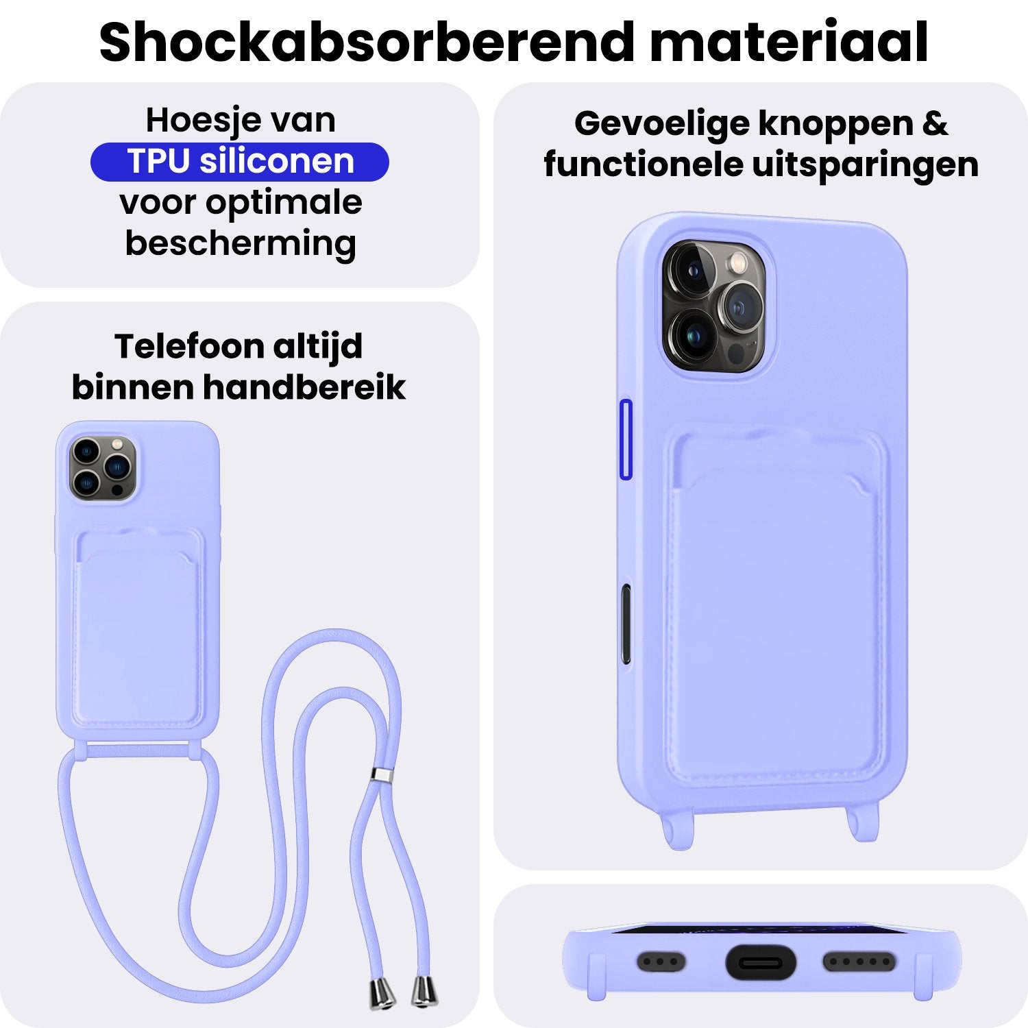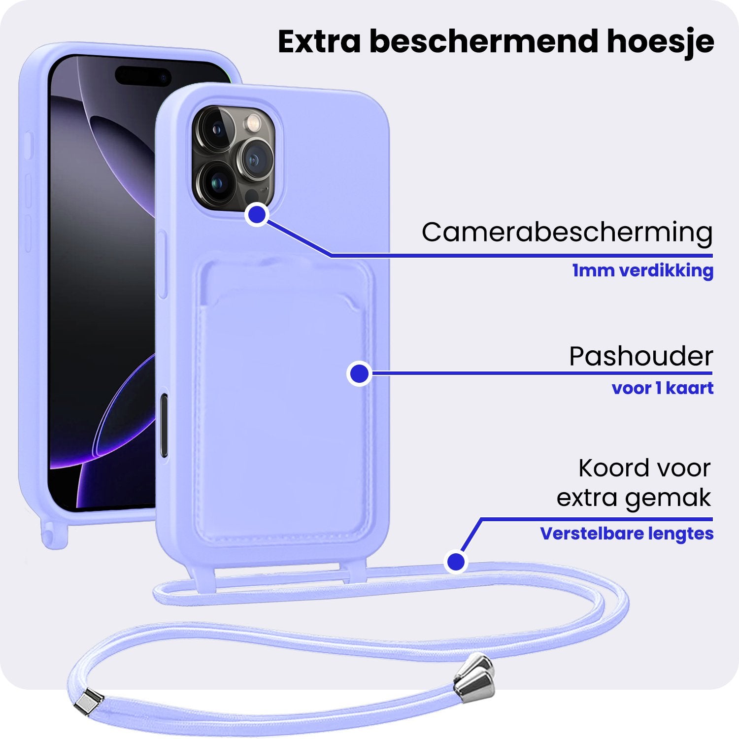 - Verstelbaar koord – Draag je telefoon handsfree en veilig om je nek of schouder