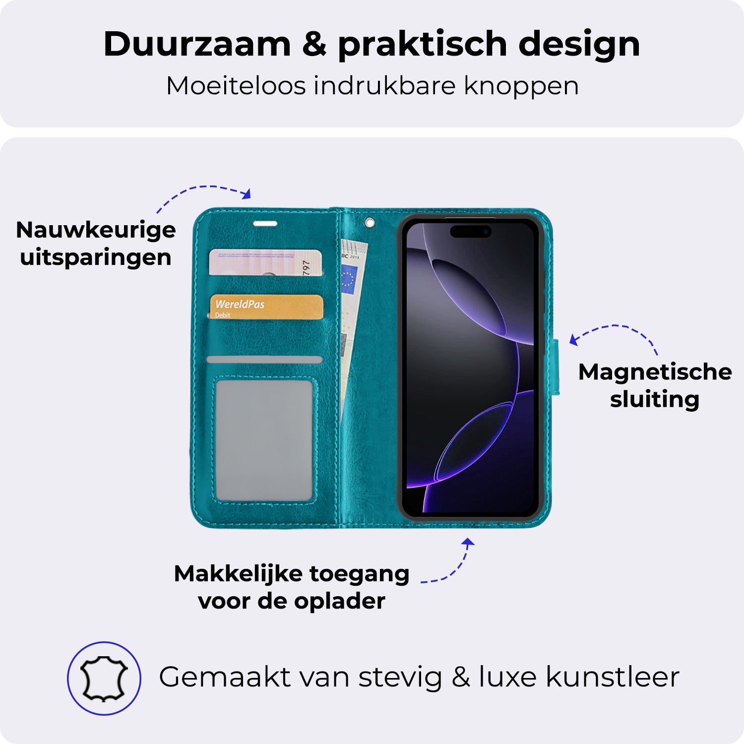 - Ruimte voor pasjes en briefgeld