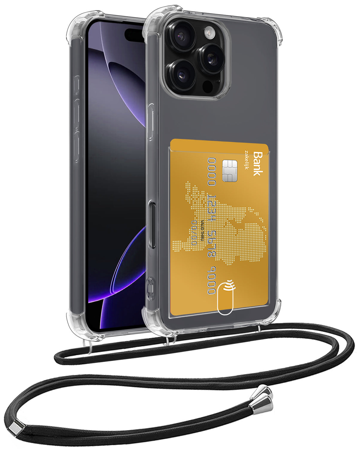 iPhone 16 Pro Max Hoesje Kaarthouder met Koord Backcover Shockproof - Transparant