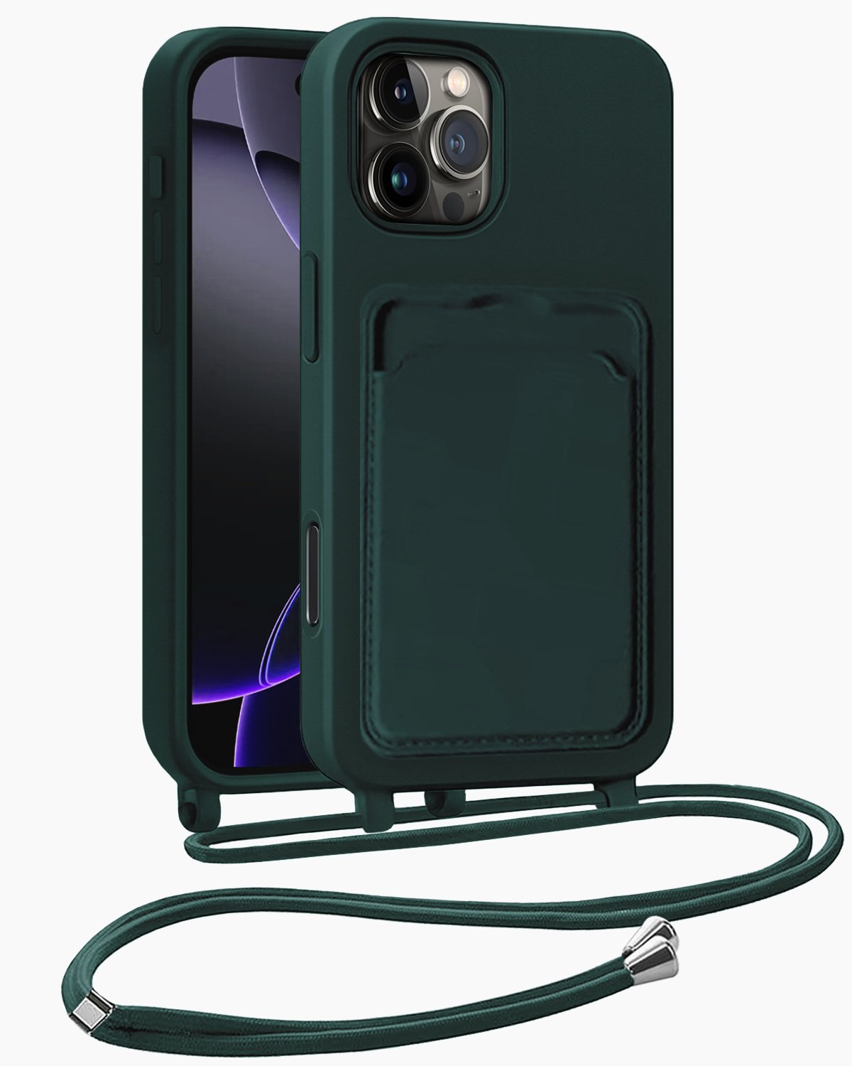 iPhone 16 Pro Max Hoesje Met Telefoonkoord en Pasjeshouder Siliconen - Donkergroen