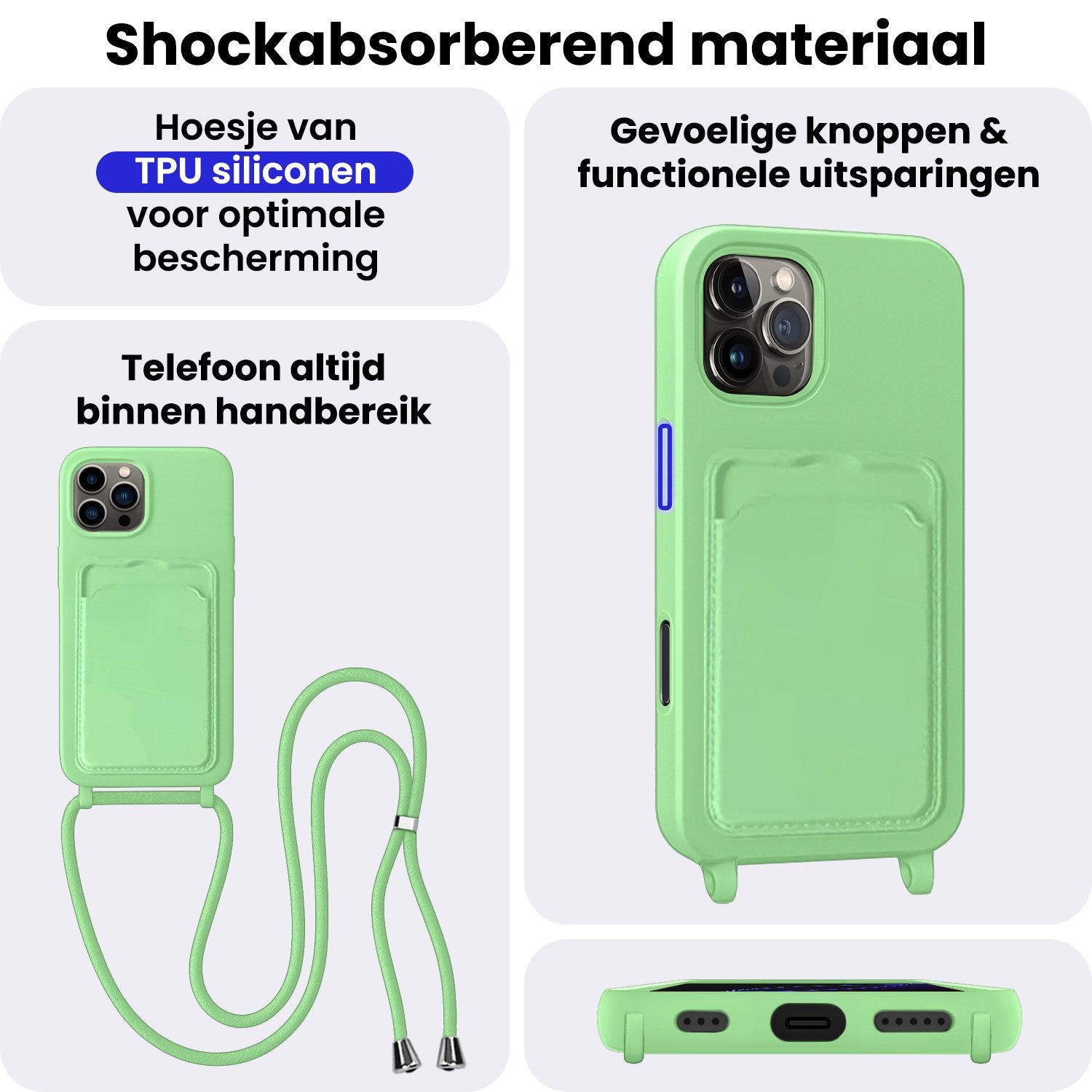 - Verstelbaar koord – Draag je telefoon handsfree en veilig om je nek of schouder