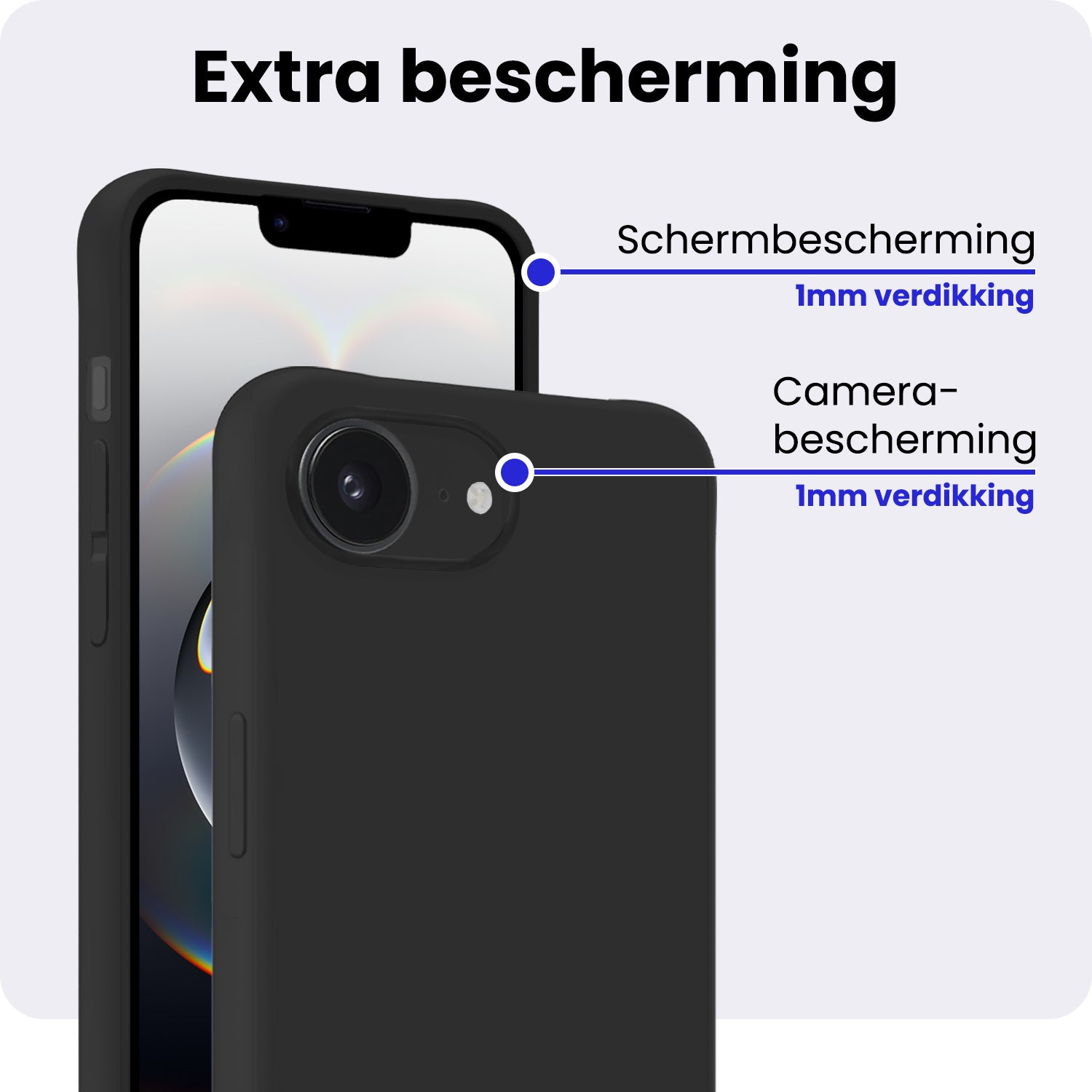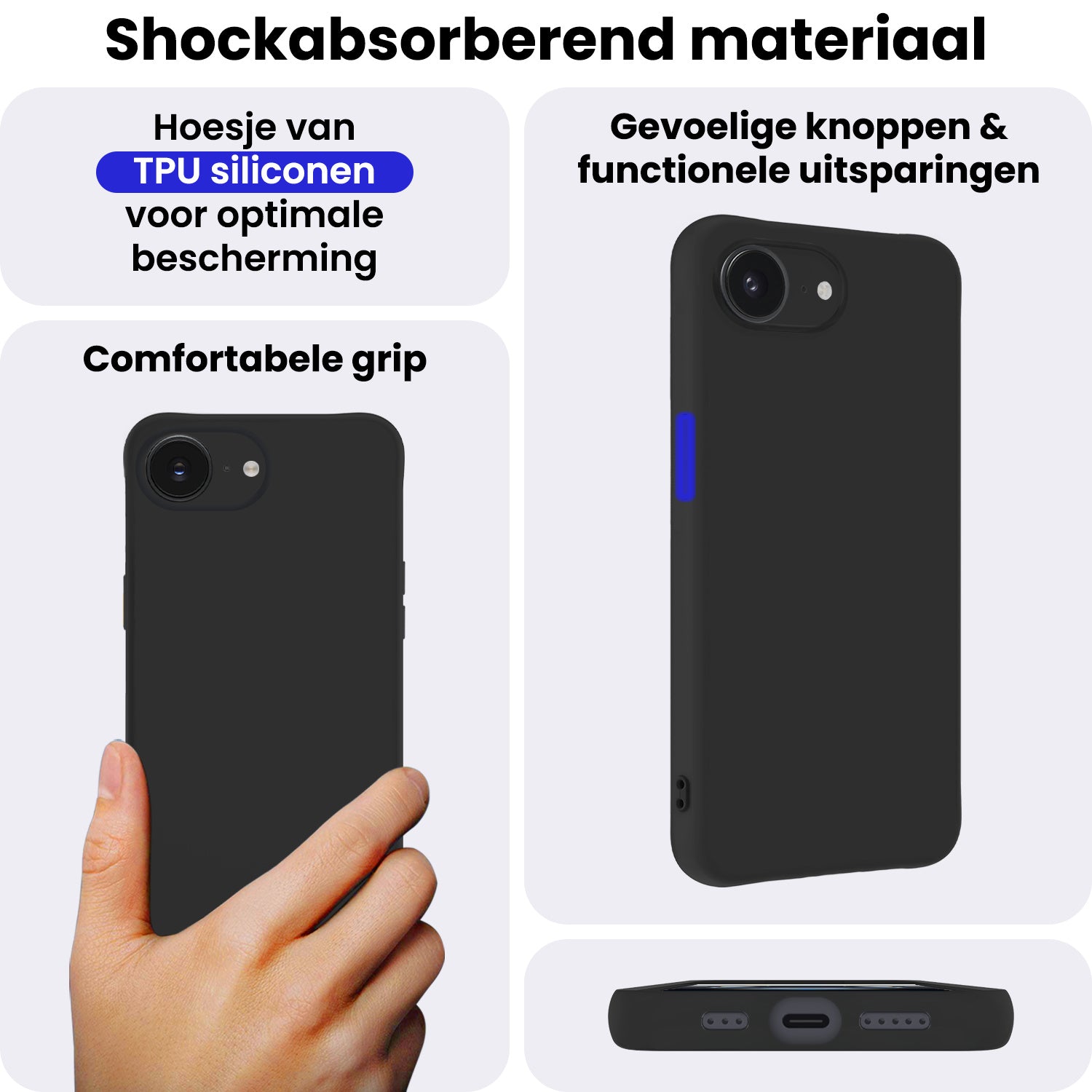 Dit siliconen hoesje voor de iPhone 16e is gemaakt van flexibel en schokabsorberend TPU-materiaal, waardoor het je toestel optimaal beschermt tegen vallen en stoten. De verhoogde randen rond het scherm en de camera voorkomen directe contactschade bij neerleggen op vlakke oppervlakken. Bovendien is het siliconen materiaal scheur- en slijtvast, wat een lange levensduur garandeert.