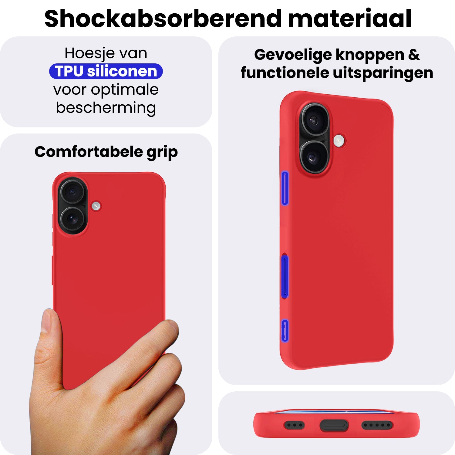 Dit siliconen hoesje voor de iPhone 17 is gemaakt van flexibel en schokabsorberend TPU-materiaal, waardoor het je toestel optimaal beschermt tegen vallen en stoten. De verhoogde randen rond het scherm en de camera voorkomen directe contactschade bij neerleggen op vlakke oppervlakken. Bovendien is het siliconen materiaal scheur- en slijtvast, wat een lange levensduur garandeert.