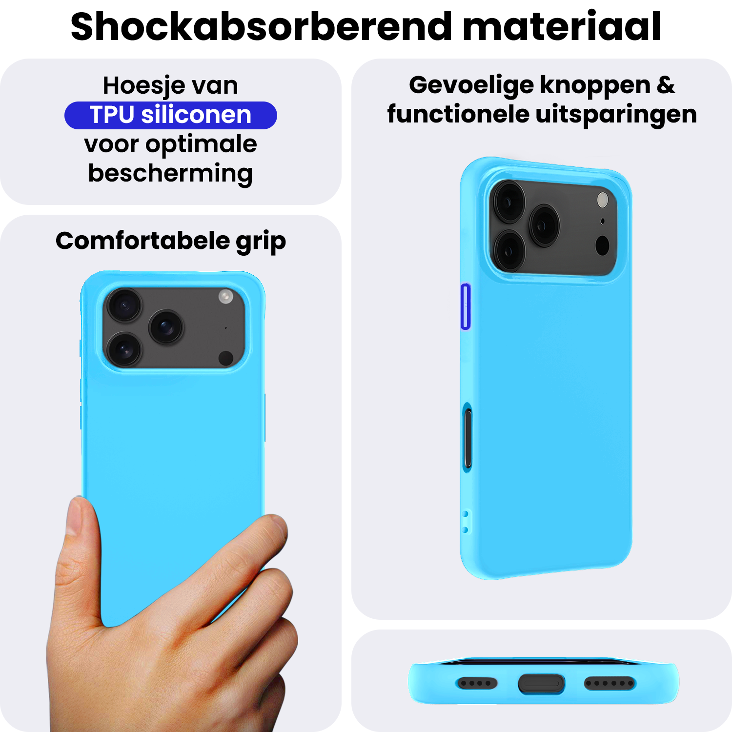 Dit siliconen hoesje voor de iPhone 17 Pro is gemaakt van flexibel en schokabsorberend TPU-materiaal, waardoor het je toestel optimaal beschermt tegen vallen en stoten. De verhoogde randen rond het scherm en de camera voorkomen directe contactschade bij neerleggen op vlakke oppervlakken. Bovendien is het siliconen materiaal scheur- en slijtvast, wat een lange levensduur garandeert.