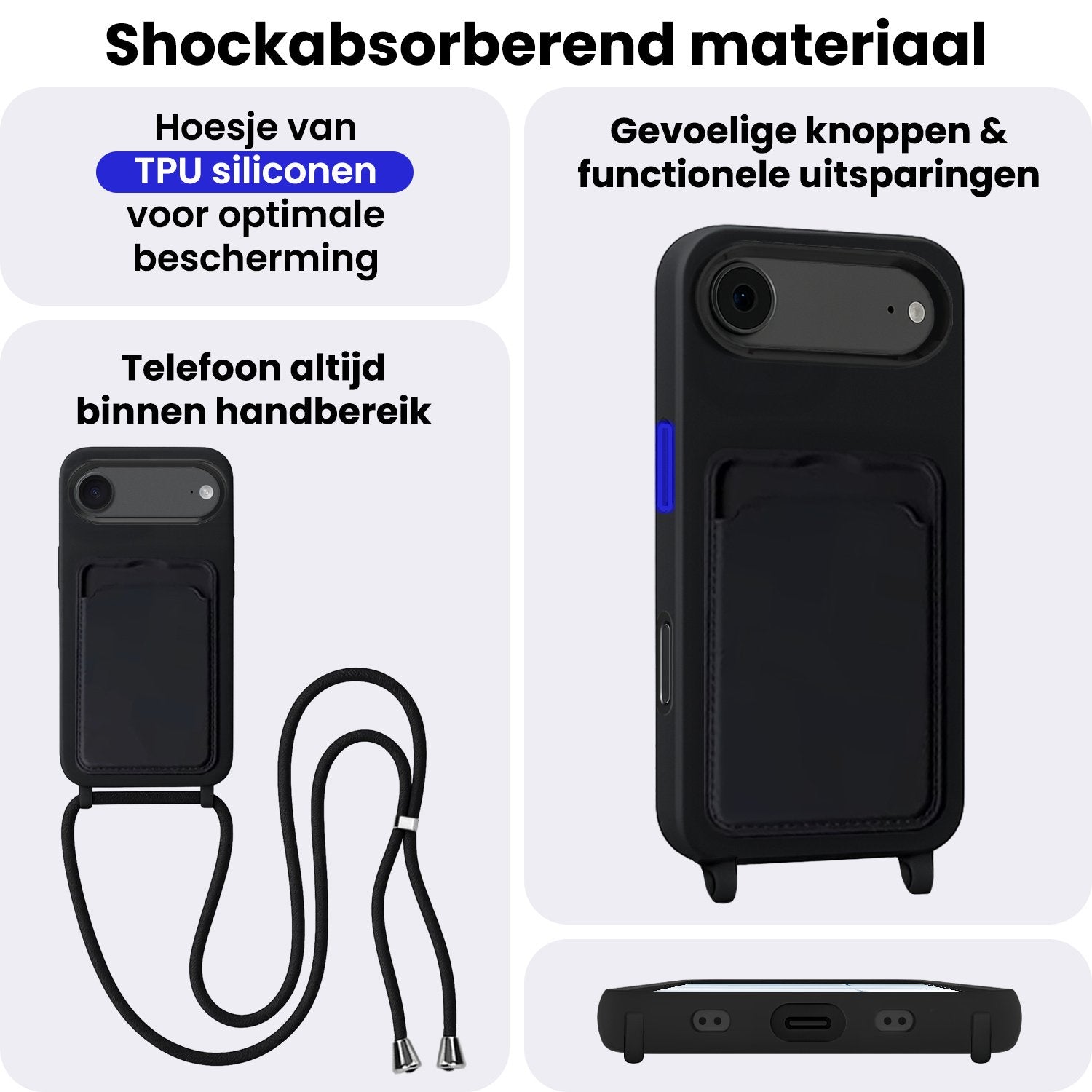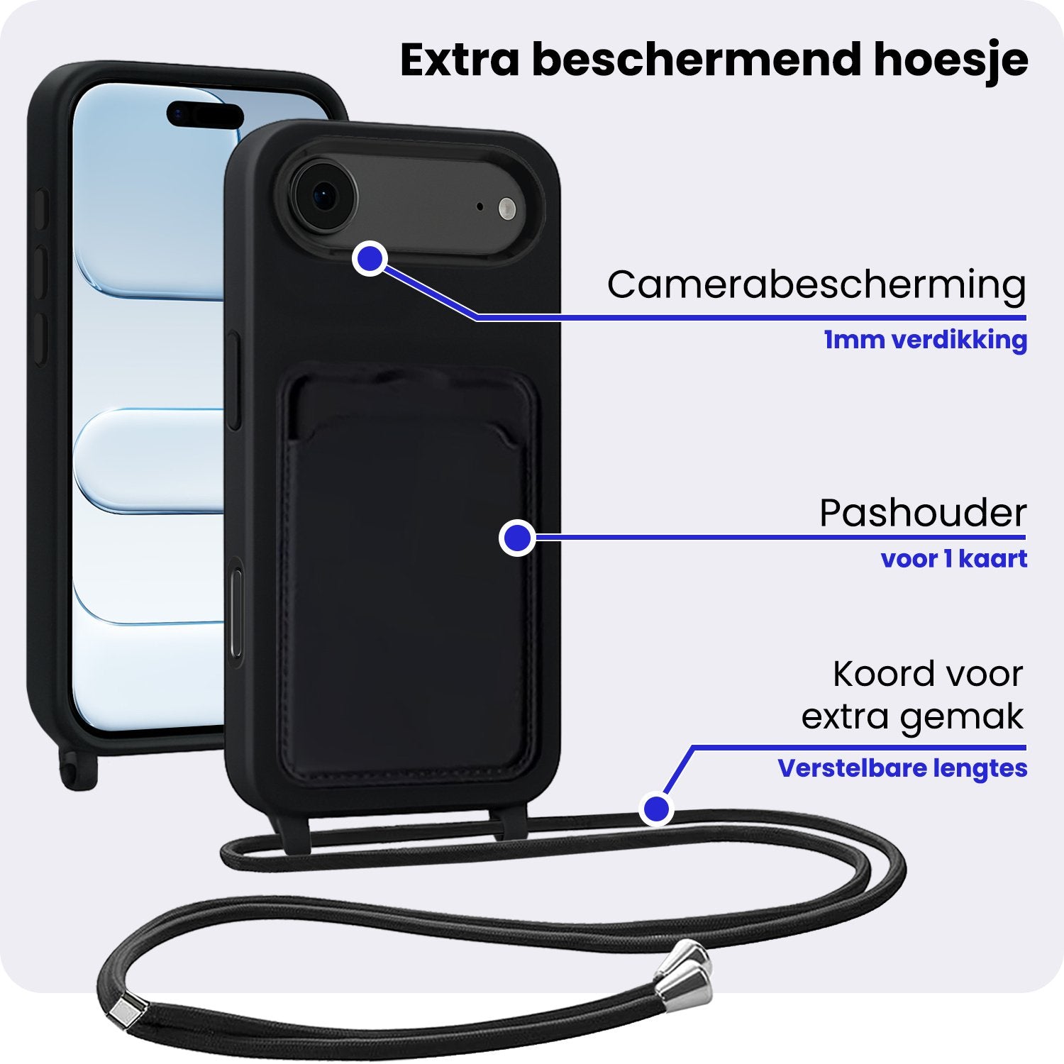 - Verstelbaar koord – Draag je telefoon handsfree en veilig om je nek of schouder
