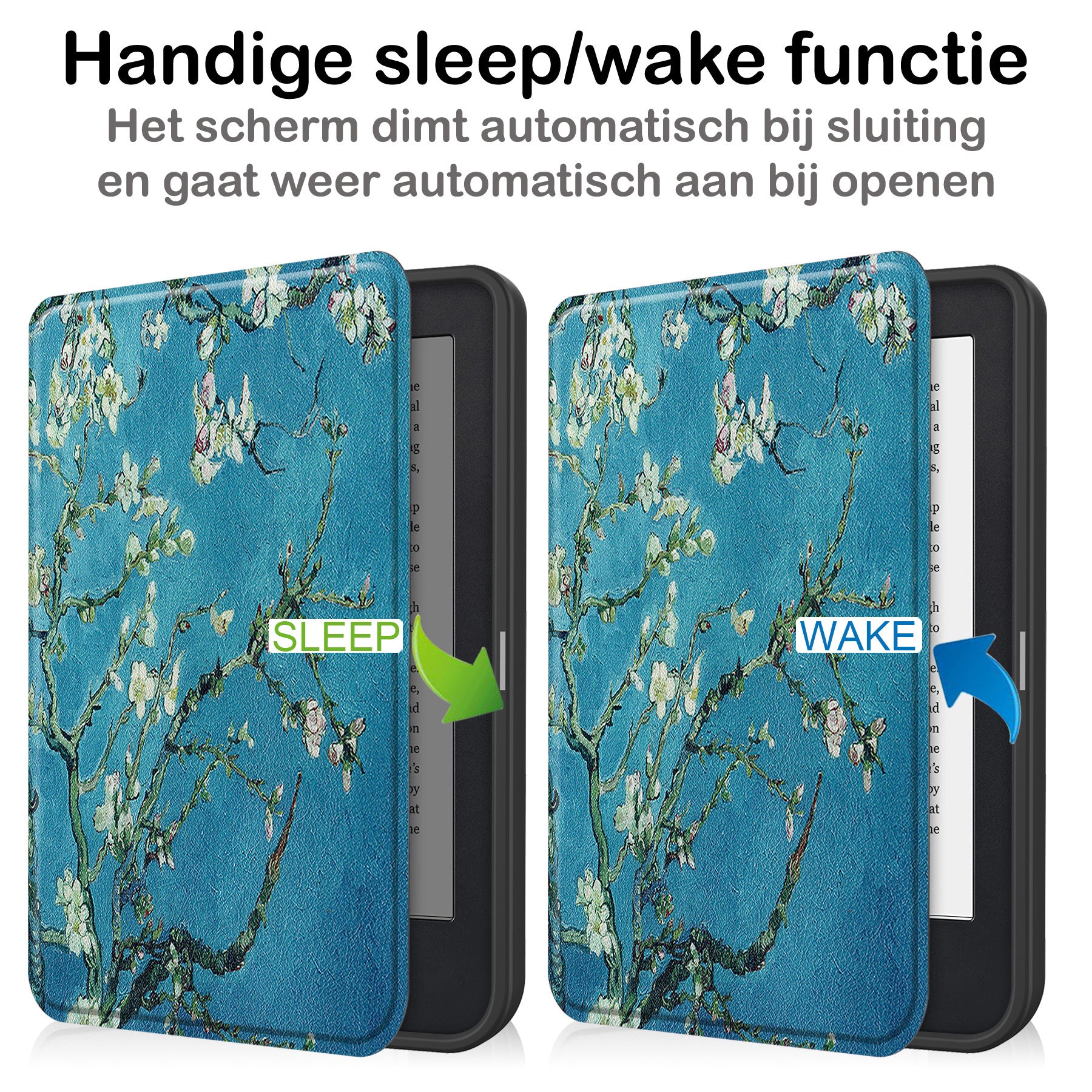 De hoes sluit stevig en beschermt je e-reader wanneer deze niet in gebruik is. Er is bewust gekozen voor een ontwerp zonder slaapfunctie, zodat je volledige controle houdt over het aan- en uitzetten van je e-reader.