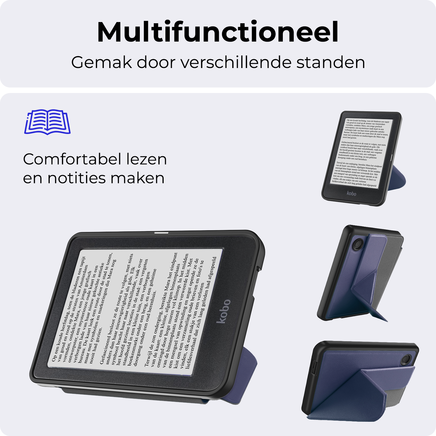 Maak je Kobo Clara BW compleet met deze trifold e-reader hoes in donkerblauwe. **Bestel nu en geniet van comfortabele bescherming en stijl!**
