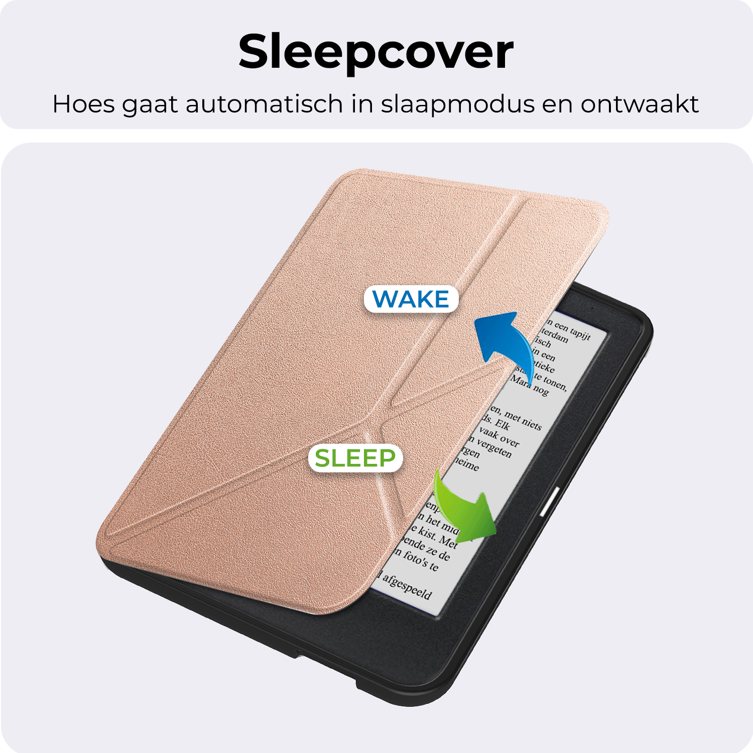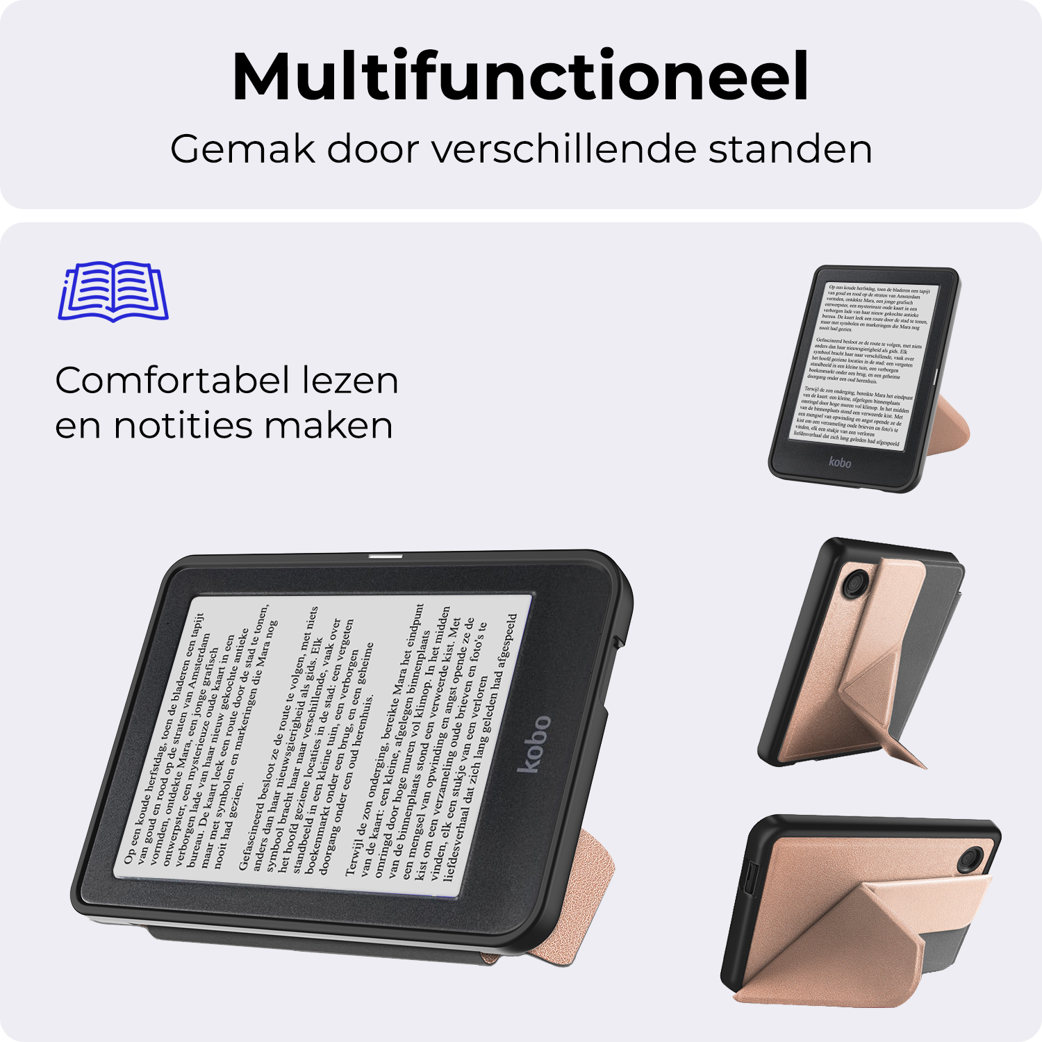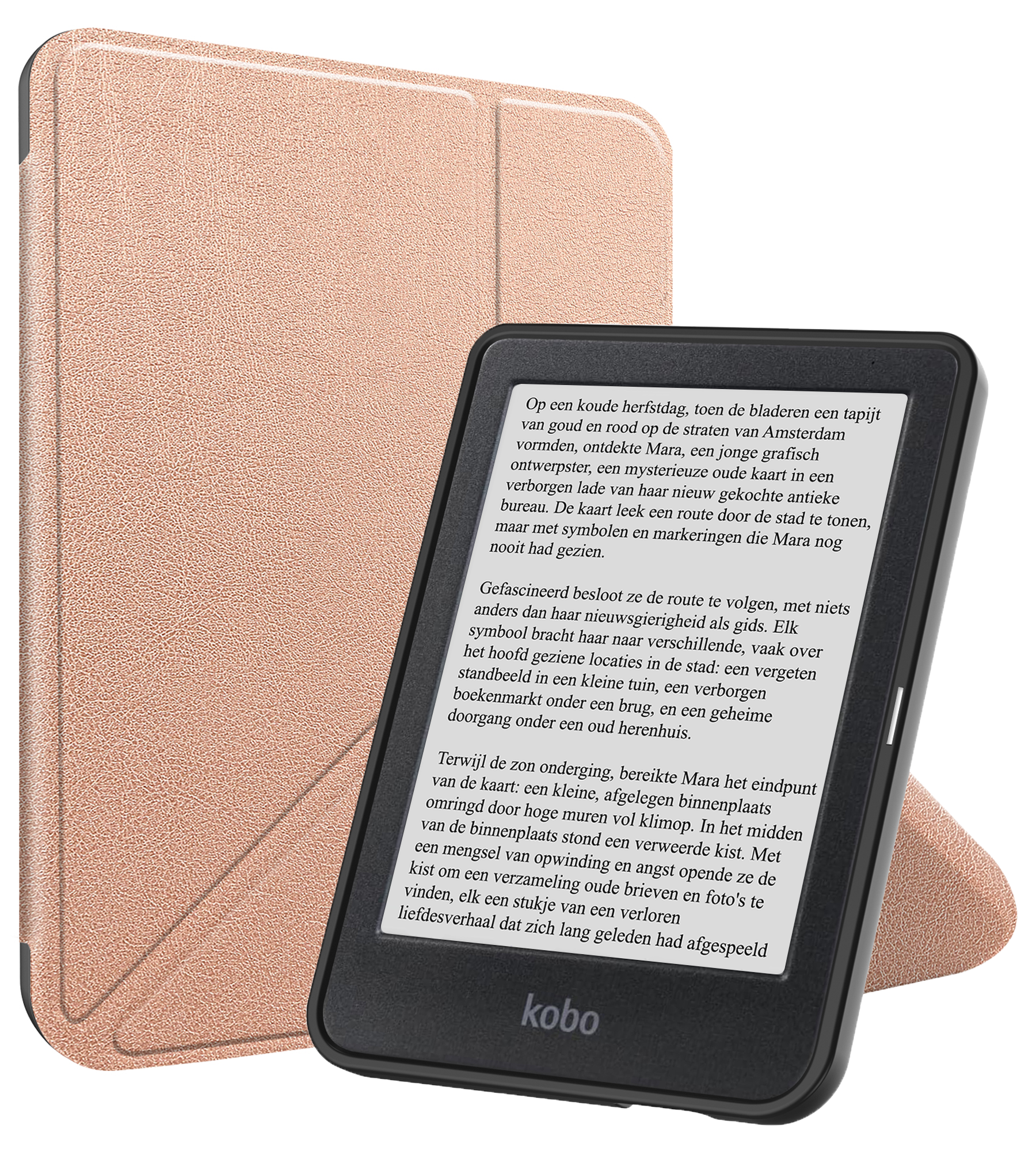 Maak je Kobo Clara BW compleet met deze trifold e-reader hoes in rosé gouden. **Bestel nu en geniet van comfortabele bescherming en stijl!**