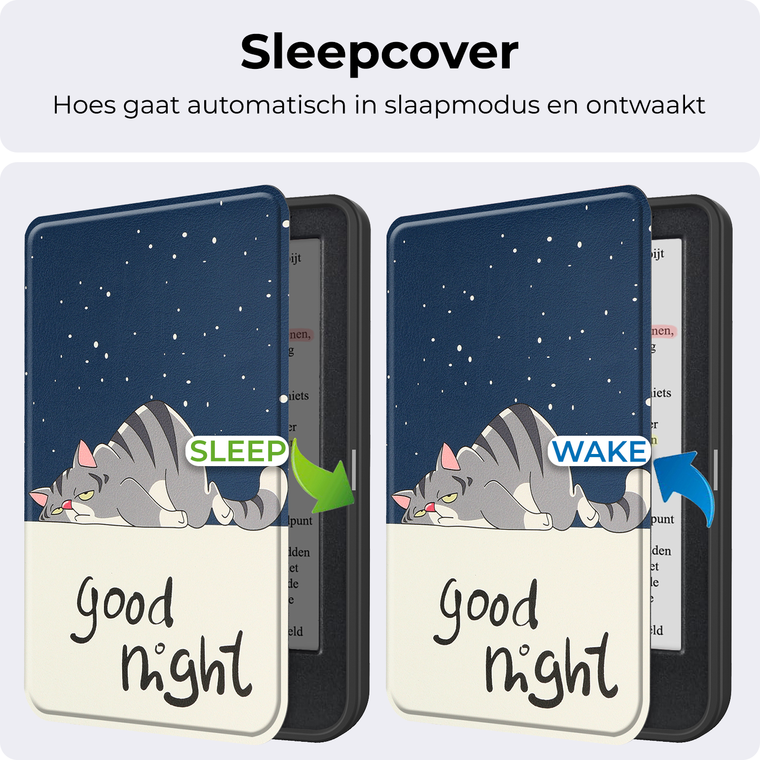 De hoes sluit stevig en beschermt je e-reader wanneer deze niet in gebruik is. Er is bewust gekozen voor een ontwerp zonder slaapfunctie, zodat je volledige controle houdt over het aan- en uitzetten van je e-reader.