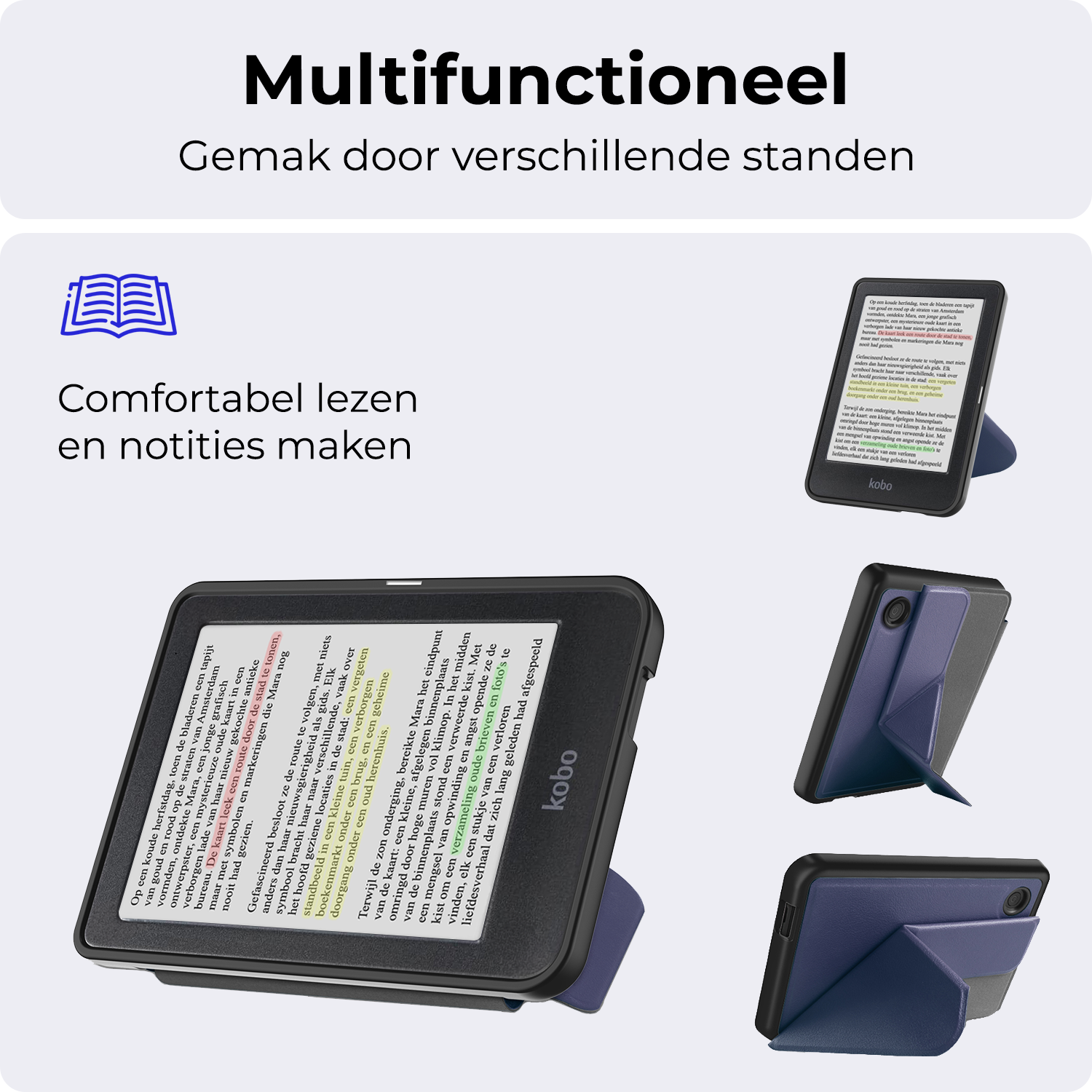 Maak je Kobo Clara Colour compleet met deze trifold e-reader hoes in donkerblauwe. **Bestel nu en geniet van comfortabele bescherming en stijl!**