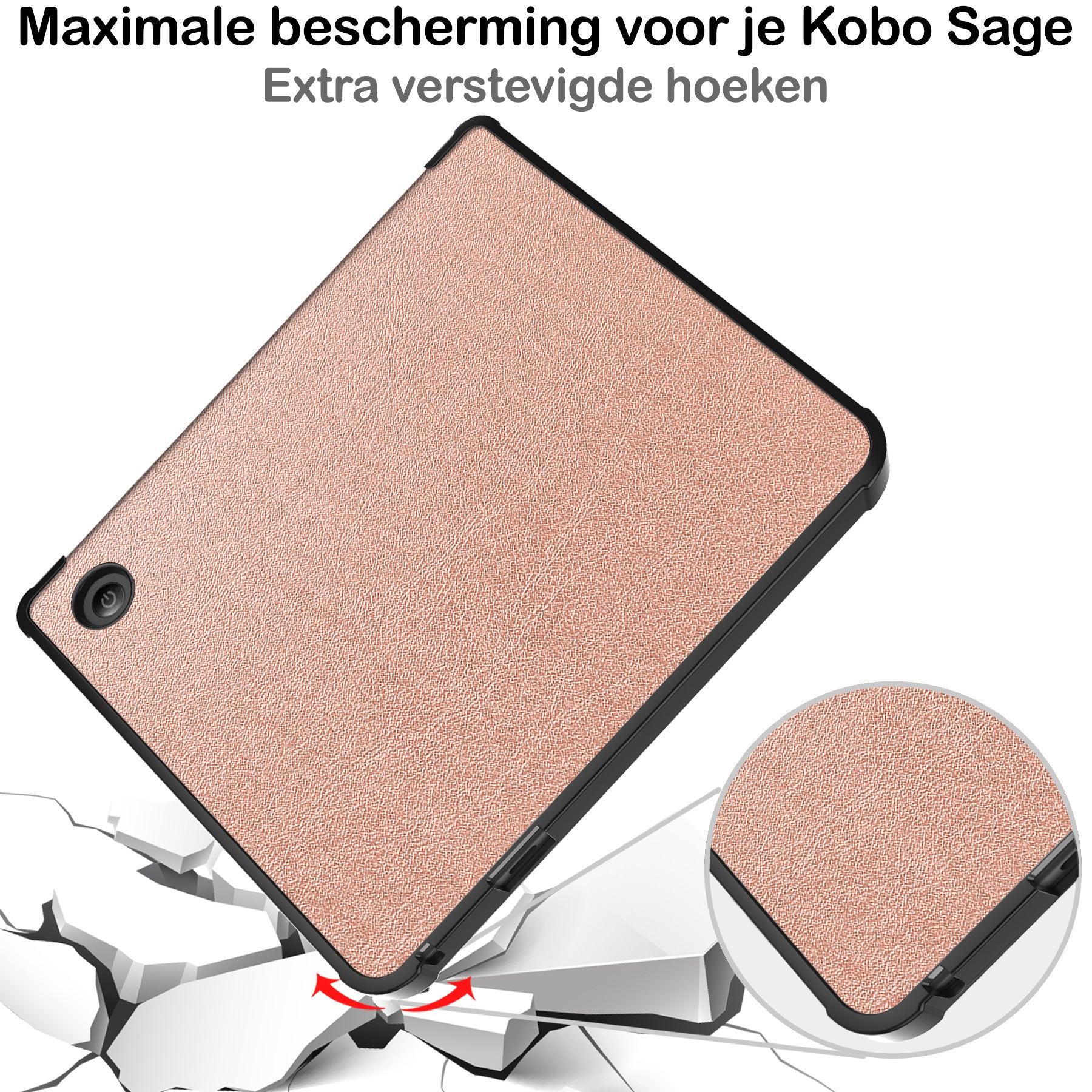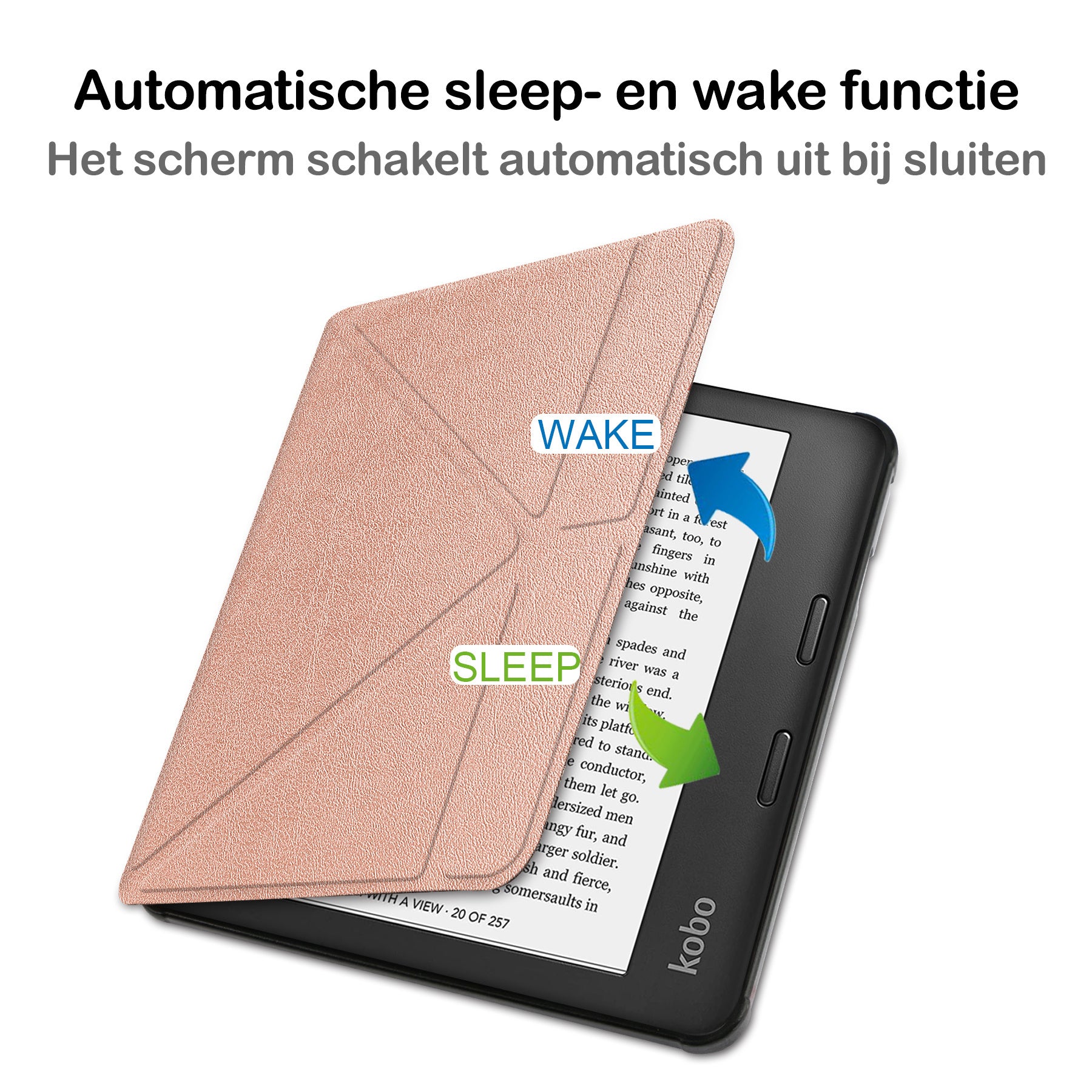 Maak je Kobo Libra 2 compleet met deze trifold e-reader hoes in rosé gouden. **Bestel nu en geniet van comfortabele bescherming en stijl!**