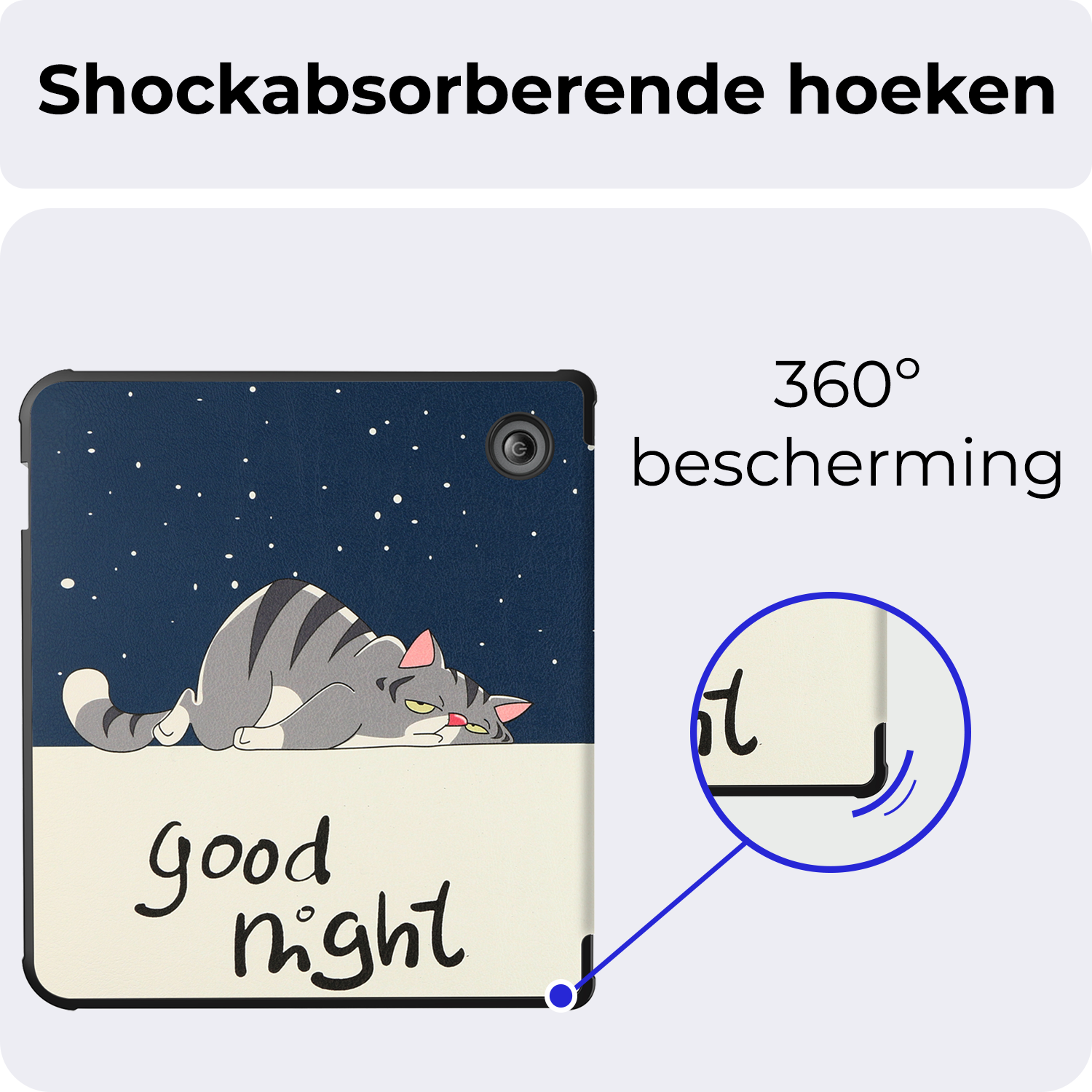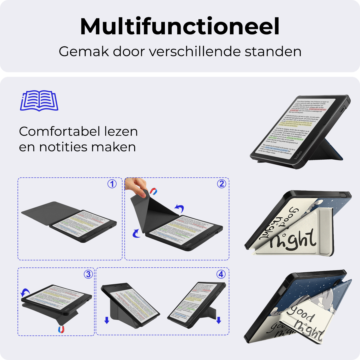 Het trifold design maakt het mogelijk om je e-reader in een stabiele stand te plaatsen. Dit zorgt voor een comfortabele leeservaring, of je nu aan tafel zit of in bed ligt.