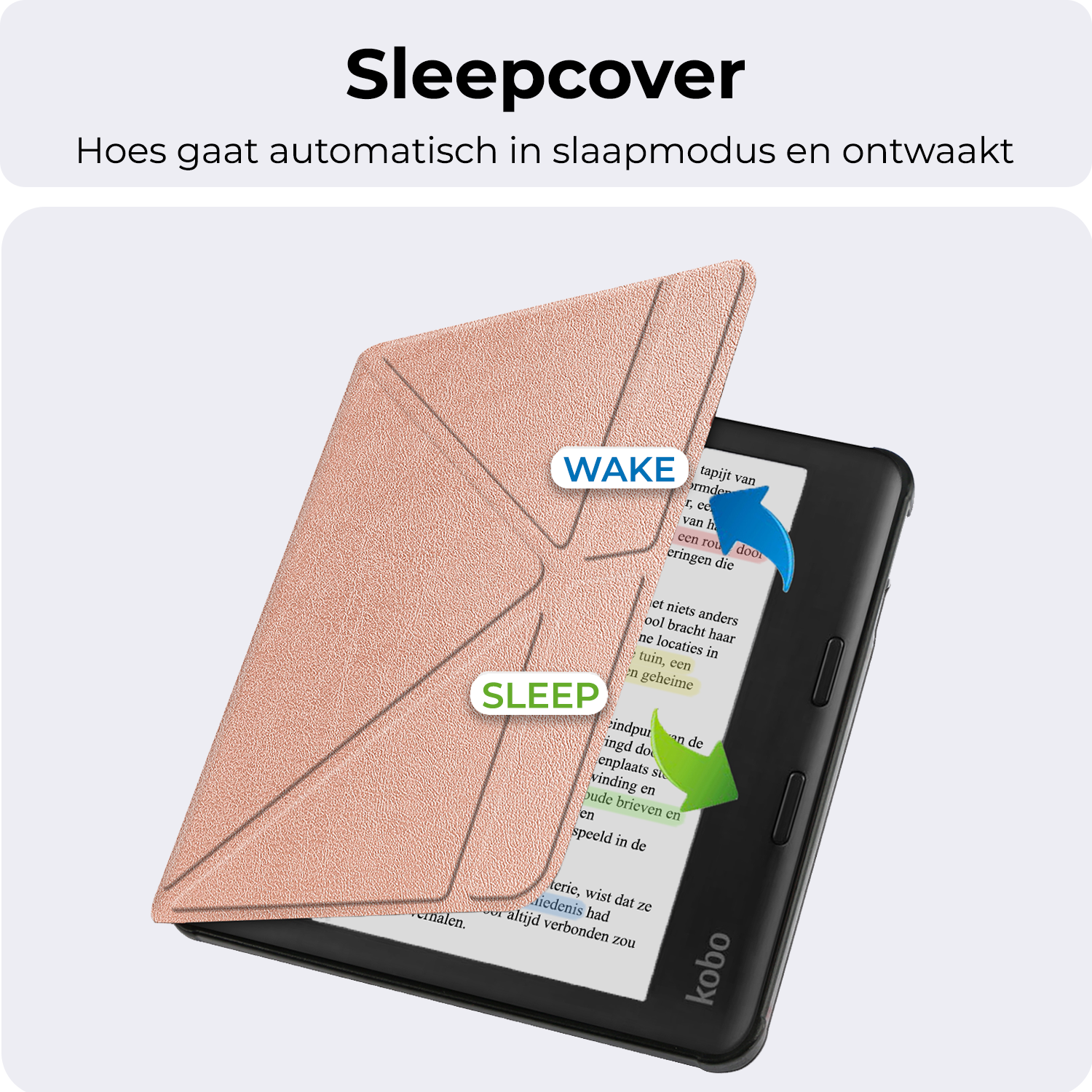 Maak je Kobo Libra Colour compleet met deze trifold e-reader hoes in rosé gouden. **Bestel nu en geniet van comfortabele bescherming en stijl!**