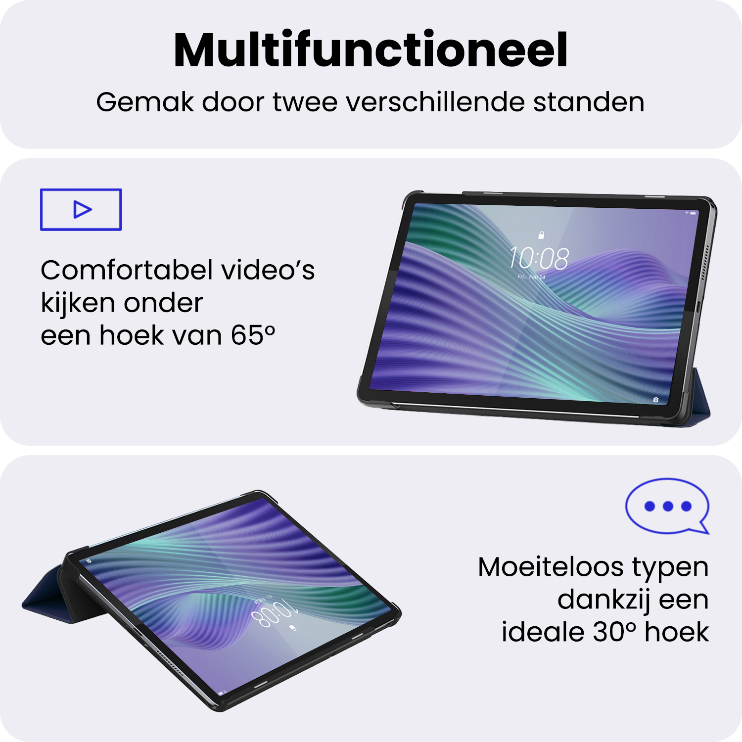 Dankzij het slimme drievoudige ontwerp vouw je de hoes eenvoudig om in twee verschillende kijkhoeken. Ideaal om handsfree video's te bekijken, te typen of te videobellen.