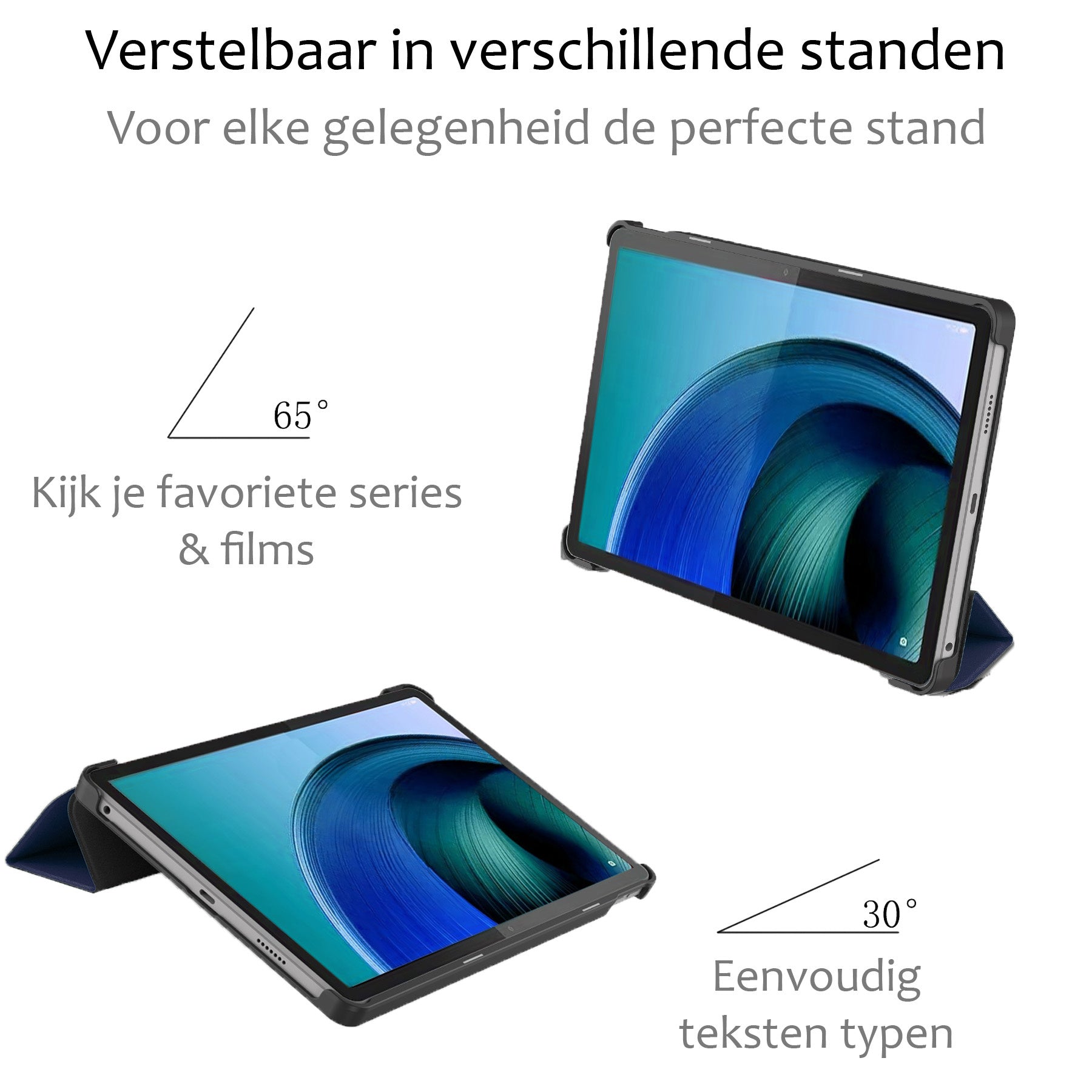 Dankzij het slimme drievoudige ontwerp vouw je de hoes eenvoudig om in twee verschillende kijkhoeken. Ideaal om handsfree video's te bekijken, te typen of te videobellen.