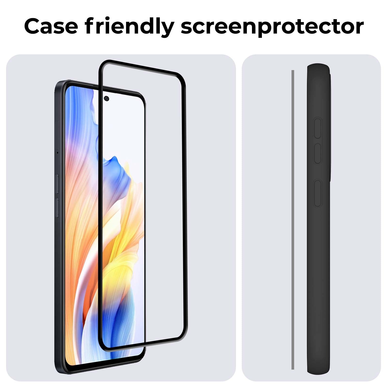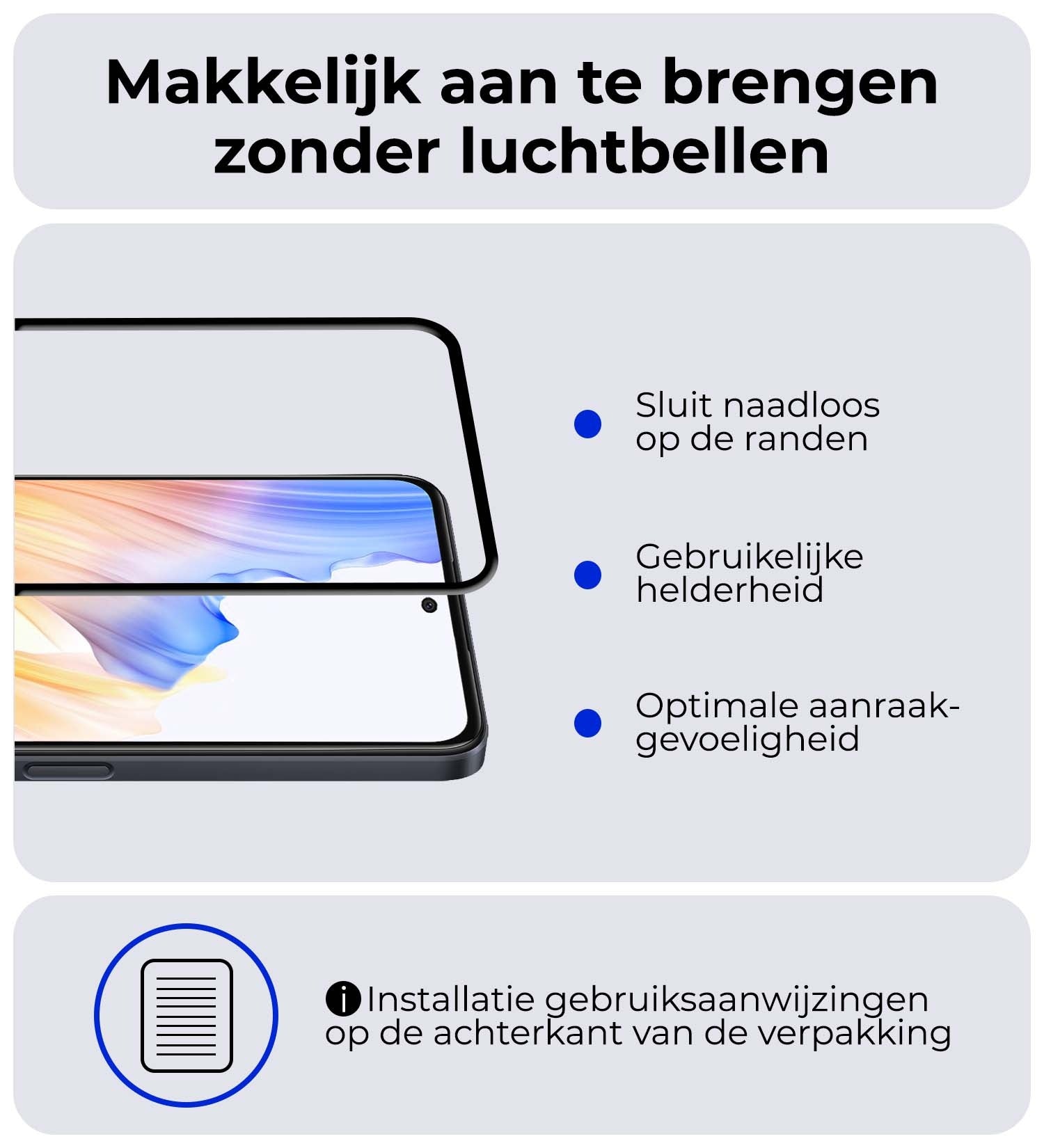 In tegenstelling tot standaard screenprotectors, biedt deze fullscreen variant volledige dekking tot aan de randen. De zwarte randen zorgen ervoor dat de protector perfect aansluit op het design van je OPPO A58, zonder storende randen of zichtbare lijmresten.