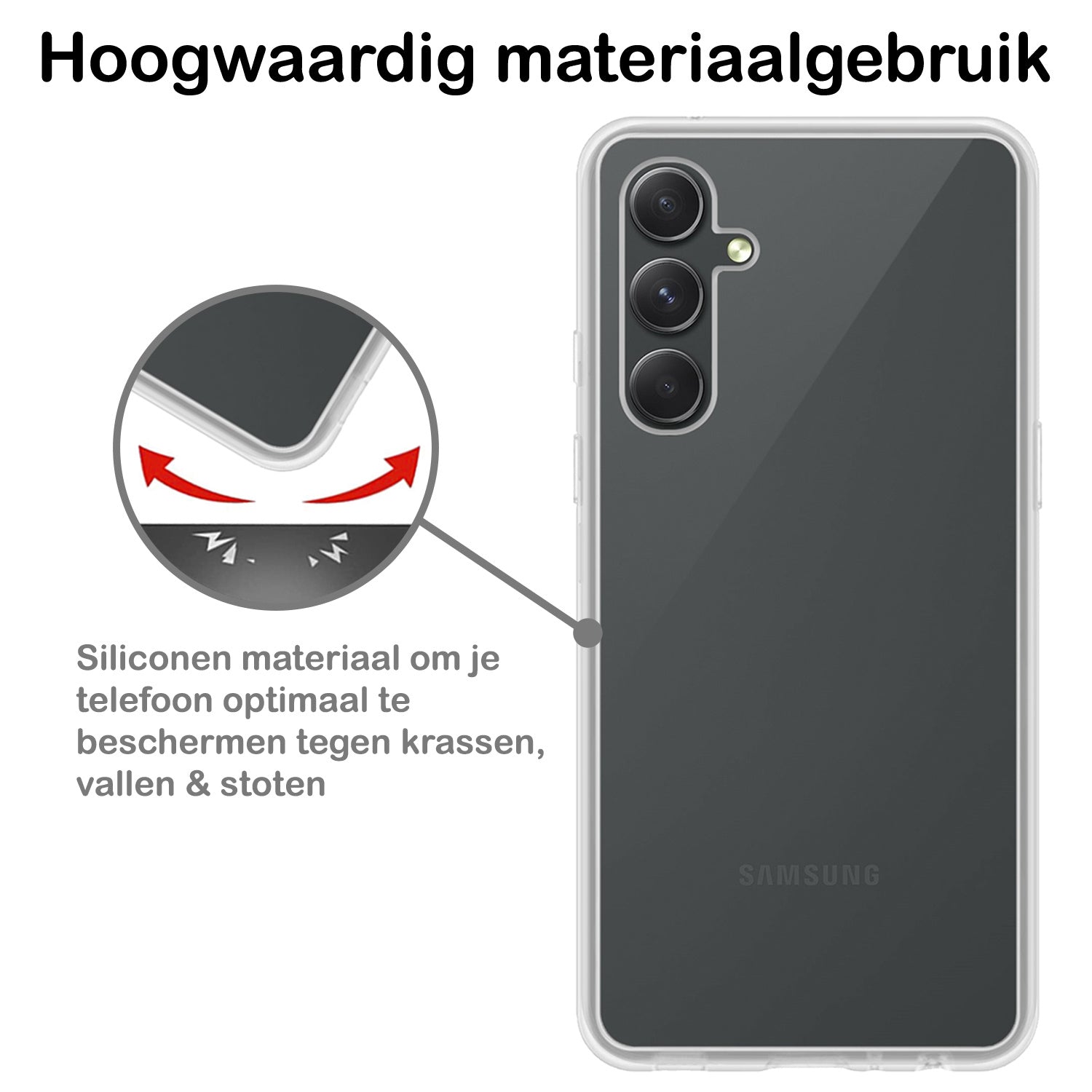 Dit siliconen hoesje voor de Samsung A14 is gemaakt van flexibel en schokabsorberend TPU-materiaal, waardoor het je toestel optimaal beschermt tegen vallen en stoten. De verhoogde randen rond het scherm en de camera voorkomen directe contactschade bij neerleggen op vlakke oppervlakken. Bovendien is het siliconen materiaal scheur- en slijtvast, wat een lange levensduur garandeert.