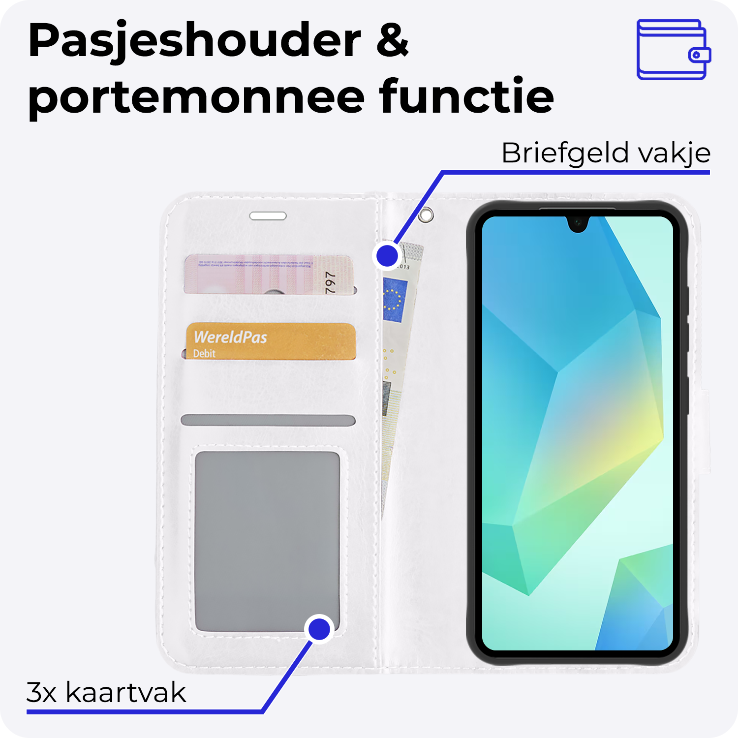 - Ruimte voor pasjes en briefgeld