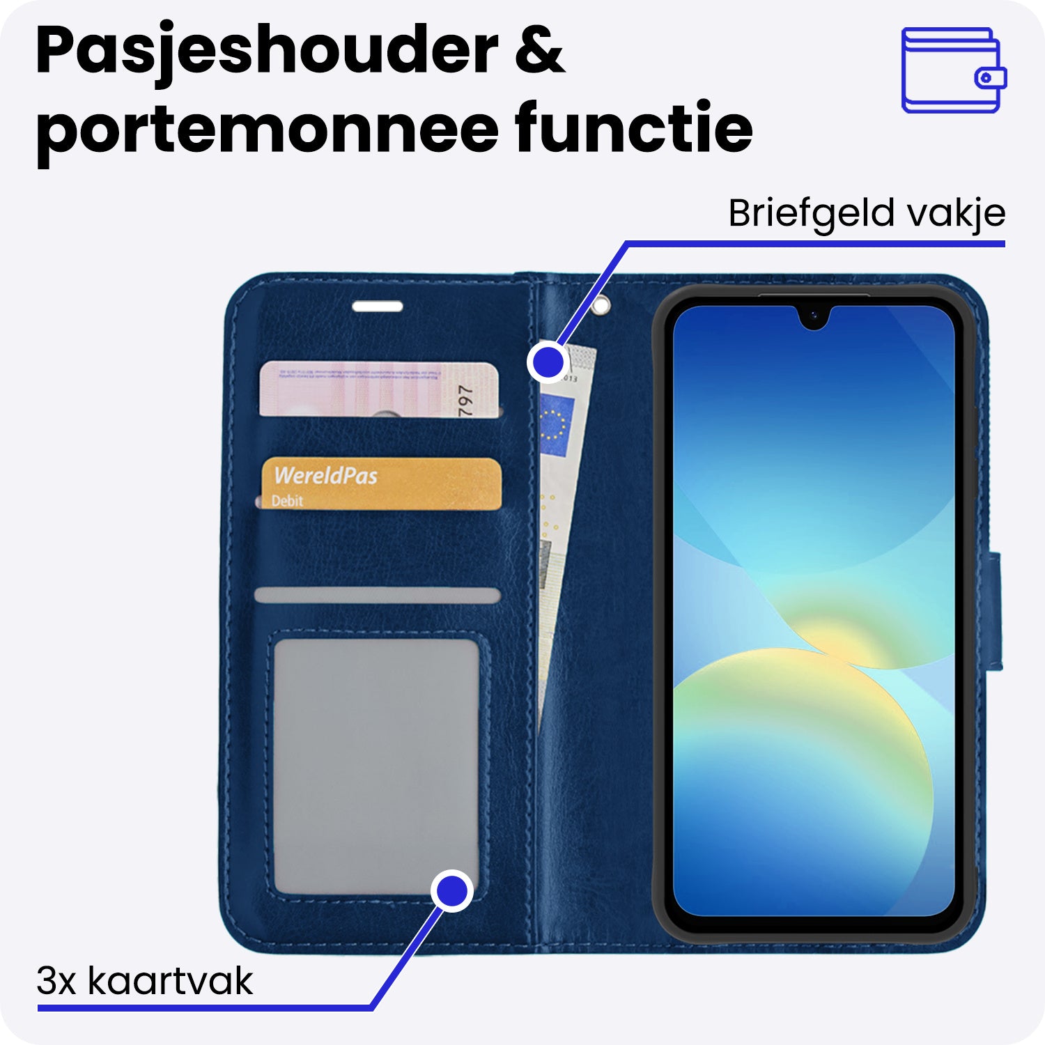 - Ruimte voor pasjes en briefgeld