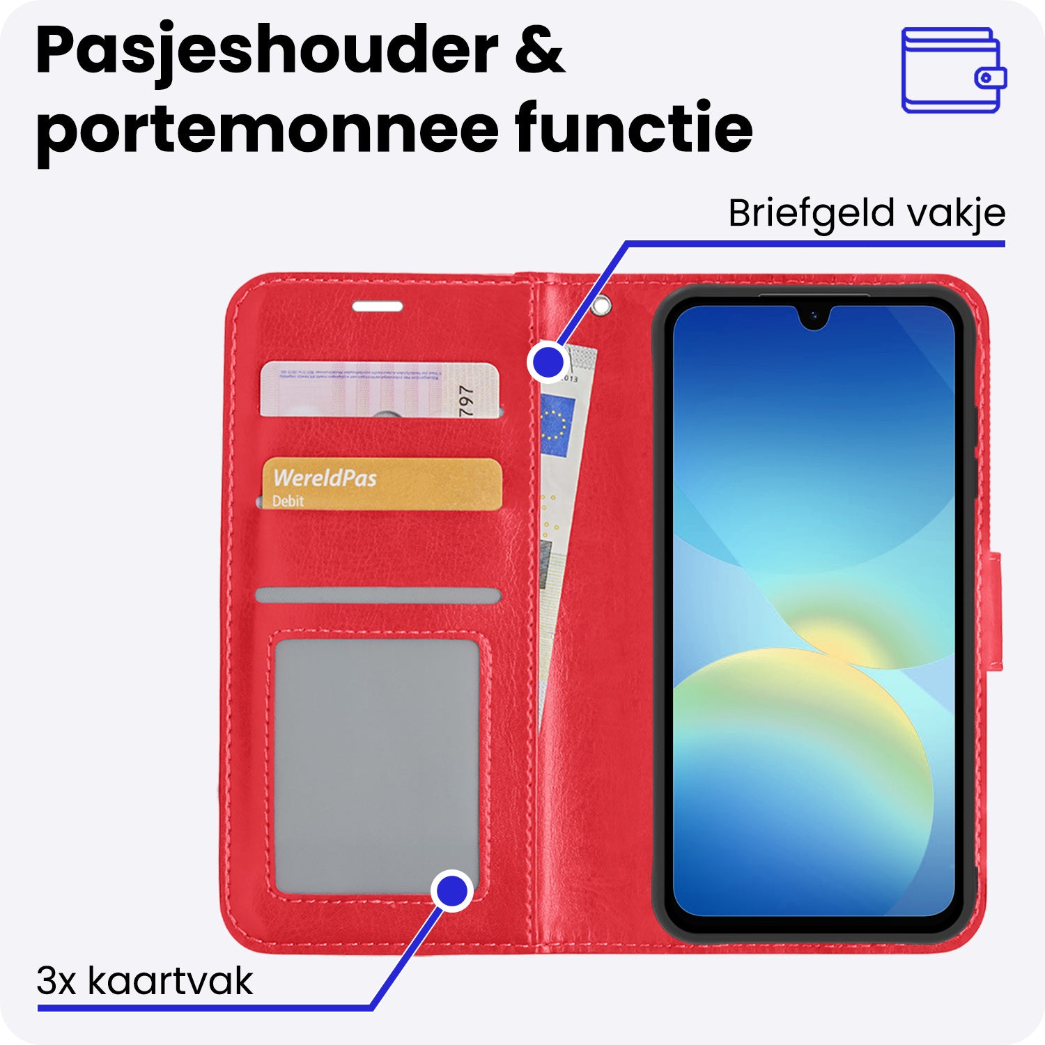 - Ruimte voor pasjes en briefgeld