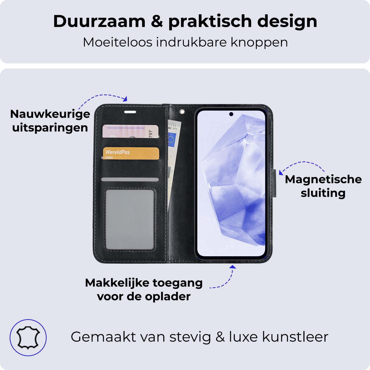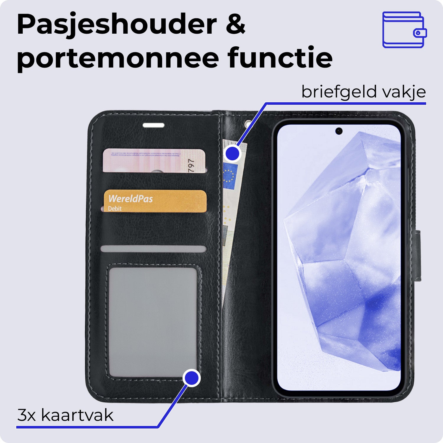 - Ruimte voor pasjes en briefgeld