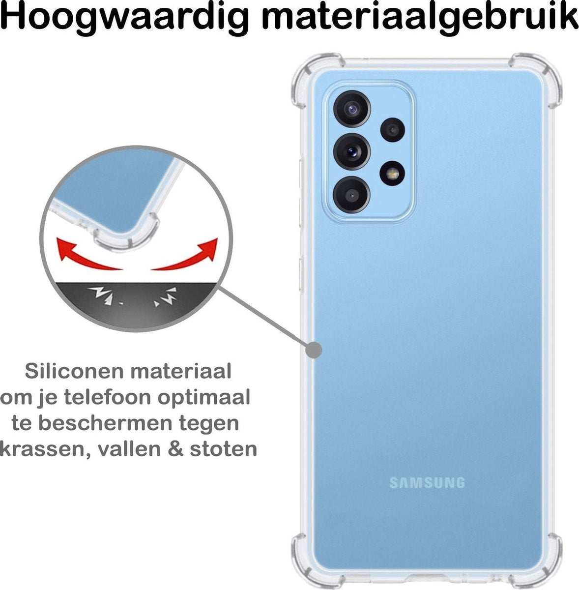 Dit shockproof hoesje is gemaakt van een combinatie van hoogwaardige materialen, waaronder een schokabsorberende TPU-laag en een stevige buitenkant voor extra duurzaamheid. De verstevigde hoeken absorberen impact bij een val, terwijl de verhoogde randen rondom het scherm en de camera krassen en schade voorkomen. Je Samsung A52 blijft veilig, ongeacht de situatie.