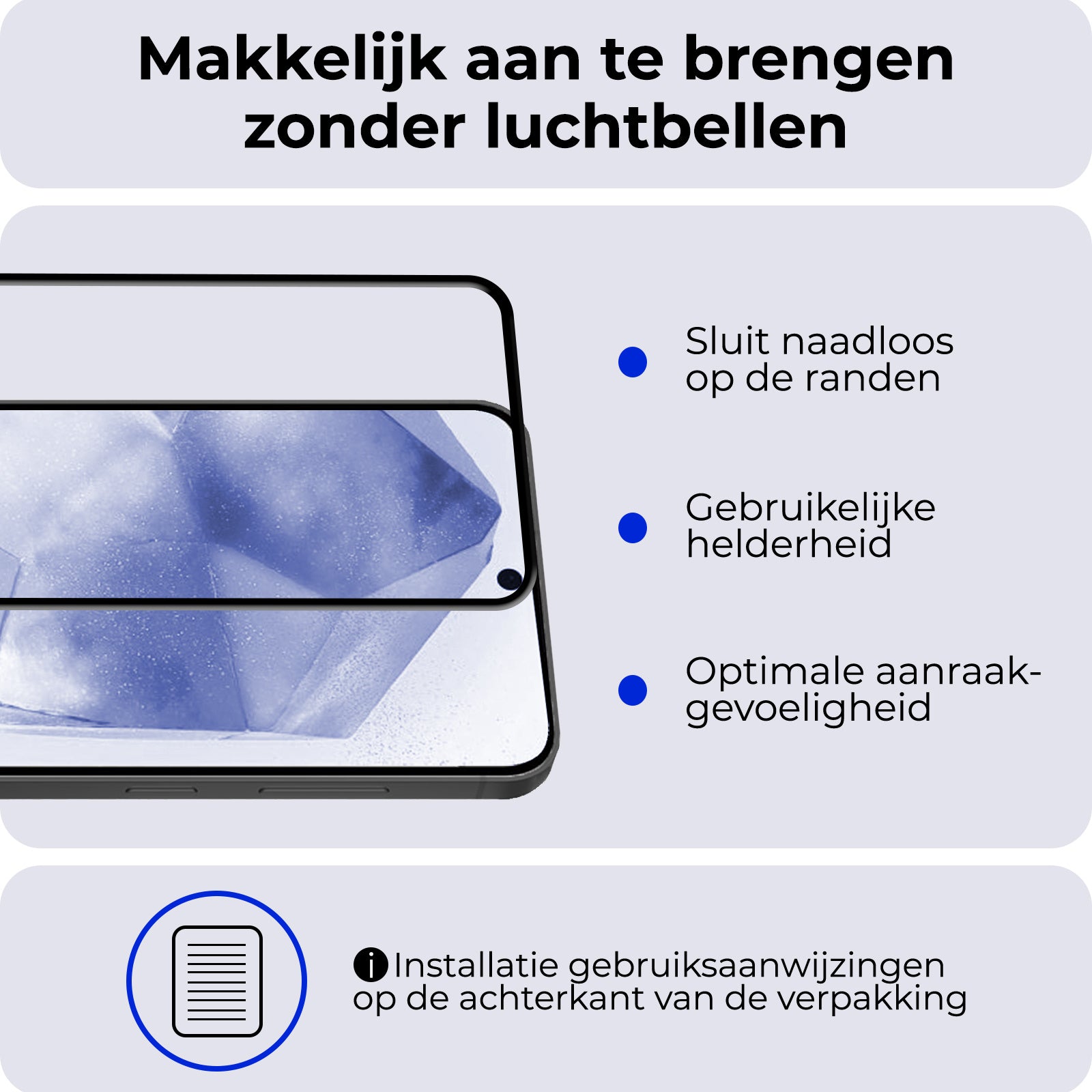 In tegenstelling tot standaard screenprotectors, biedt deze fullscreen variant volledige dekking tot aan de randen. De zwarte randen zorgen ervoor dat de protector perfect aansluit op het design van je Samsung A55, zonder storende randen of zichtbare lijmresten.