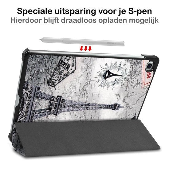 Maak je Samsung Galaxy Tab S6 Lite compleet met deze functionele en stijlvolle Trifold Bookcase Hoes - eiffeltoren-patroon. **Bestel nu en ervaar de perfecte balans tussen bescherming en gebruiksgemak!**