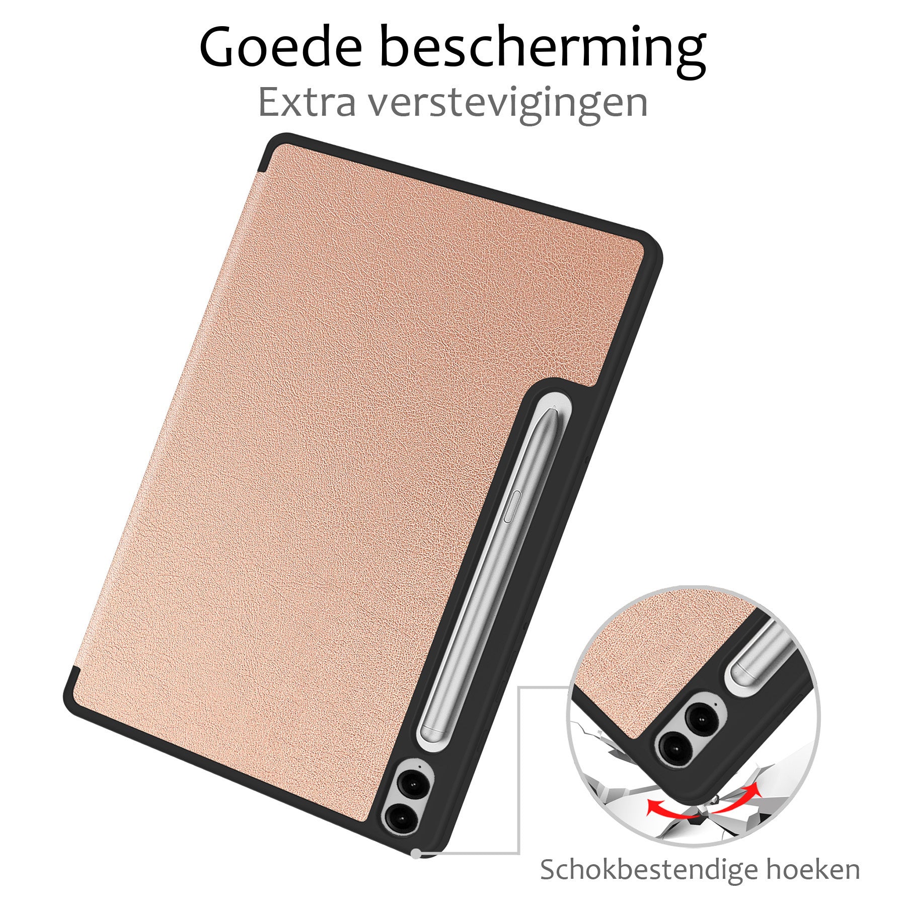 Maak je Samsung Galaxy Tab S9 FE Plus compleet met deze functionele en stijlvolle Trifold Bookcase Hoes - rosé gouden. **Bestel nu en geniet van ultiem gemak en bescherming!**