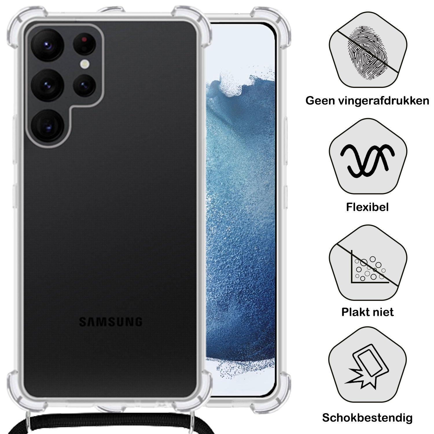 Maak je ervaring compleet met dit stevige en functionele shockproof hoesje met koord voor de Samsung S21 Ultra. **Bestel nu en geniet van de perfecte balans tussen bescherming, gemak en stijl!**