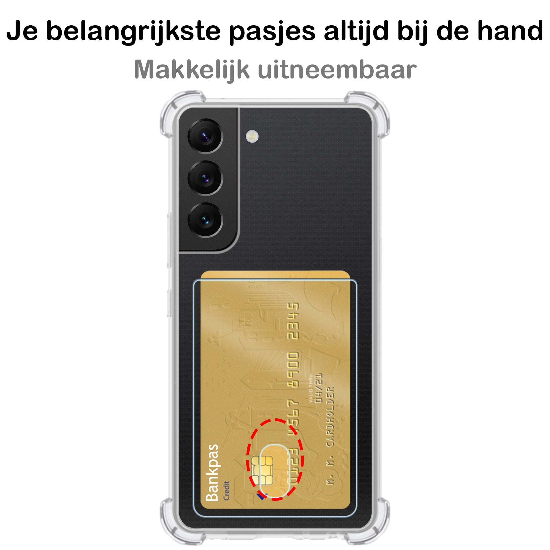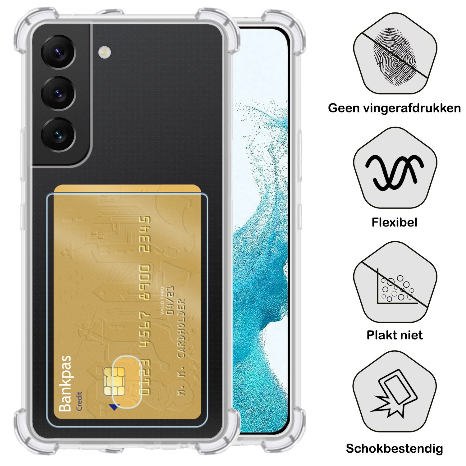 Maak je ervaring compleet met dit stevige en praktische shockproof hoesje met pashouder voor de Samsung S22 Plus. **Bestel nu en geniet van de perfecte combinatie van bescherming, gemak en stijl!**