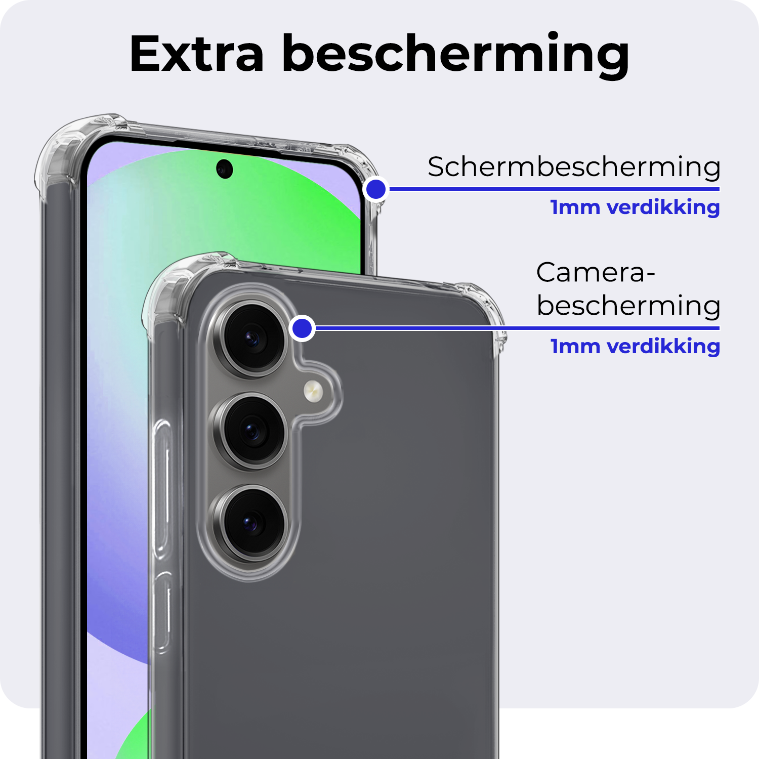 - Verhoogde randen voor extra scherm- en camerabescherming